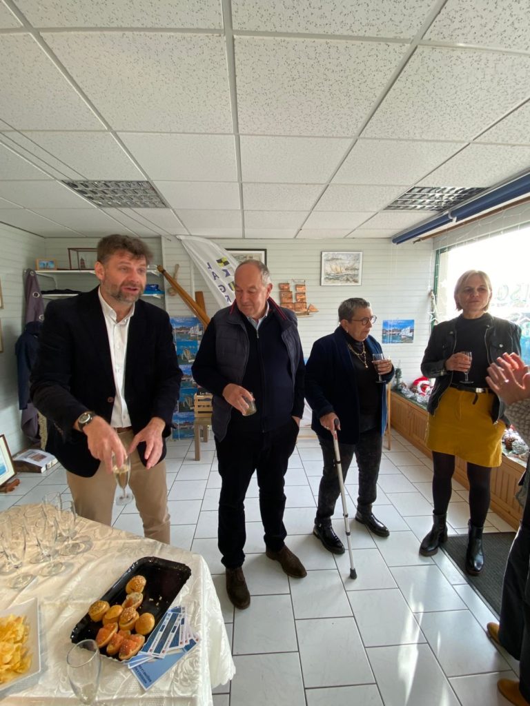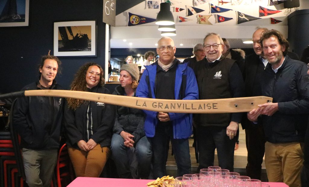 Présentation de l’équipage samedi 23 mars au Yacht Club de Granville avec une barre remise à neuf par Benoît Devain (à droite sur la photo).