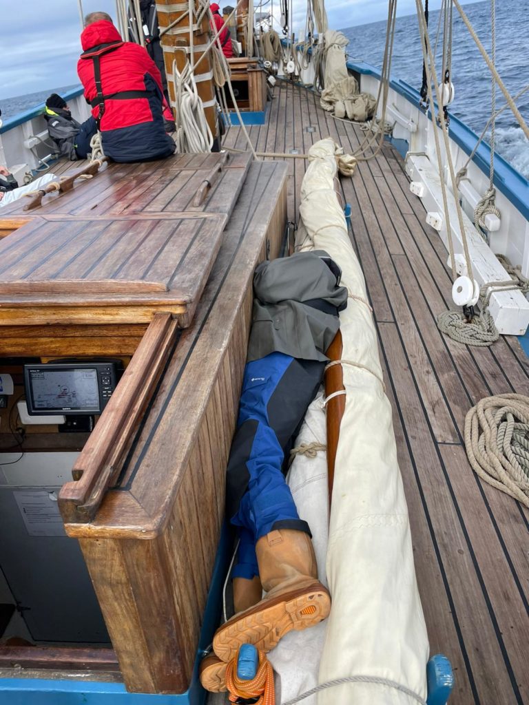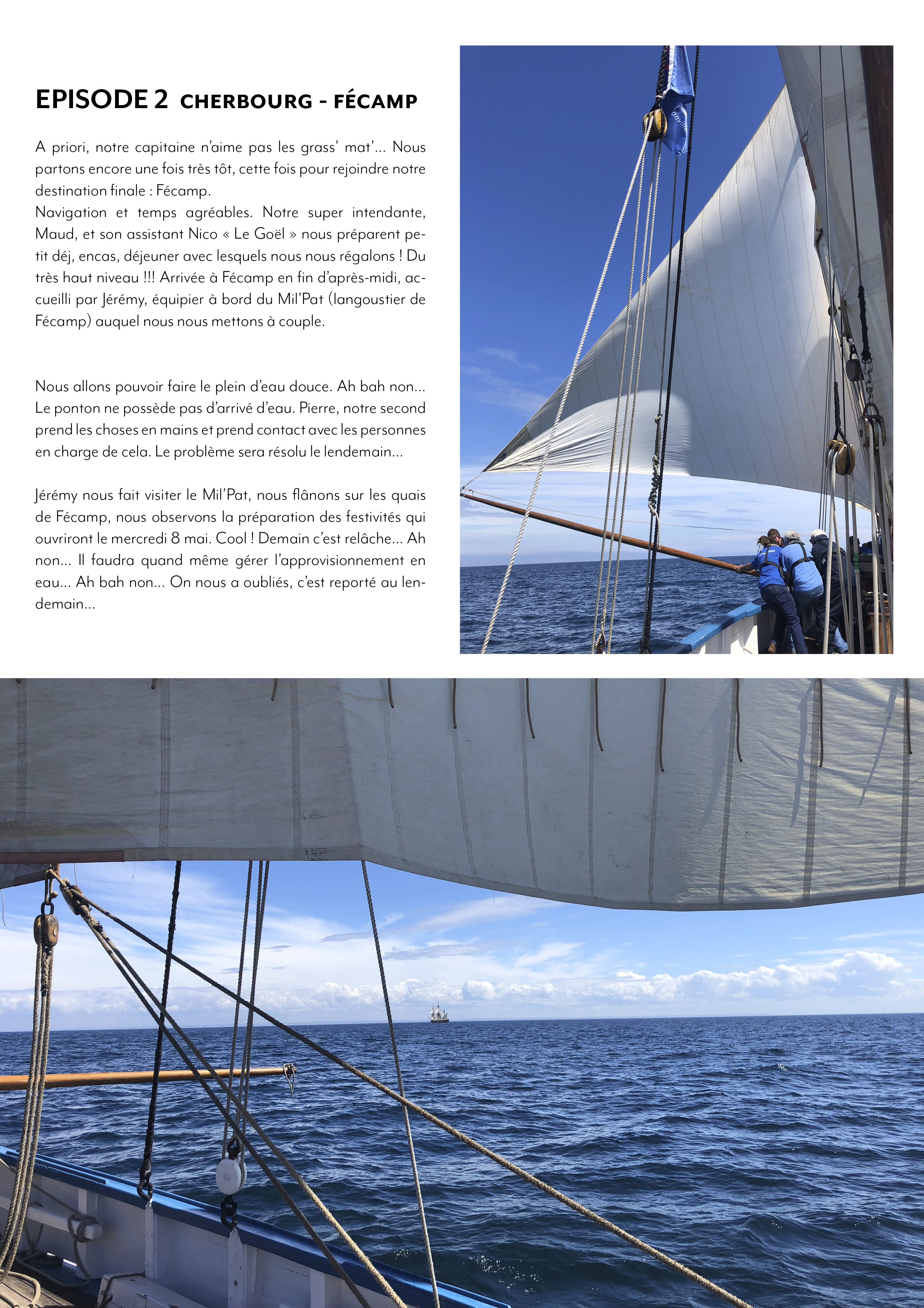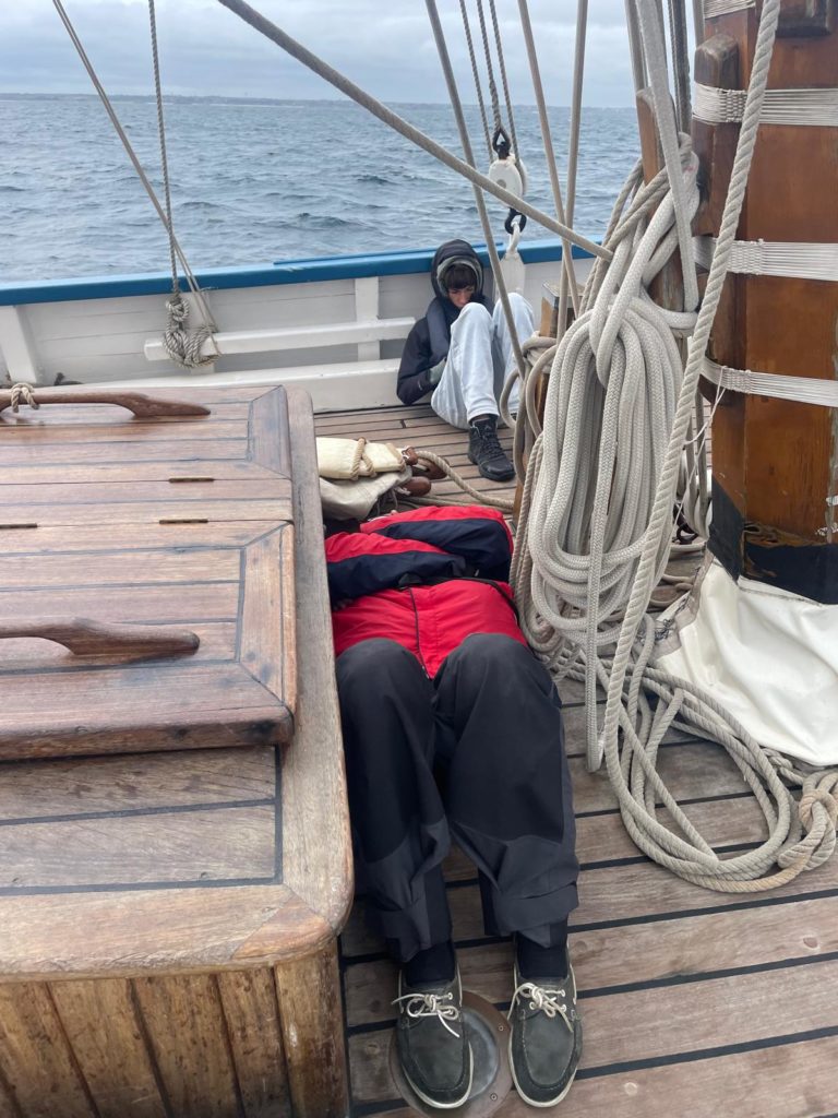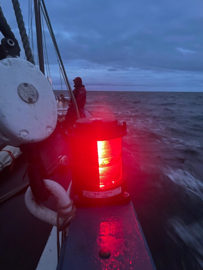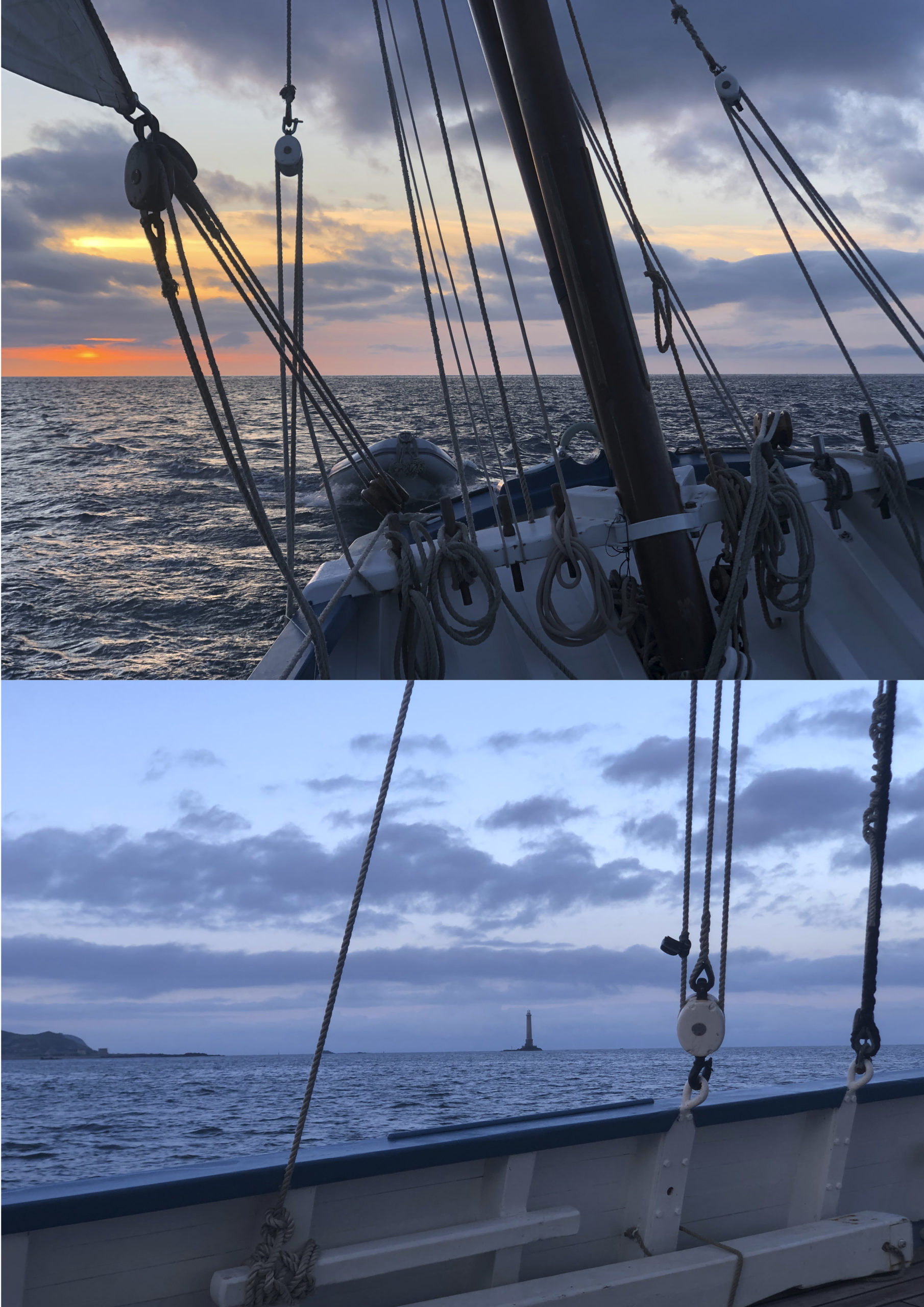 8 au 9 juillet : nuit au large de Perros-Guirrec, du vent, une mer formée. Le vent de face oblige de passer au moteur à partir de 6h00 du matin. Les quarts ont été organisés par le capitaine.