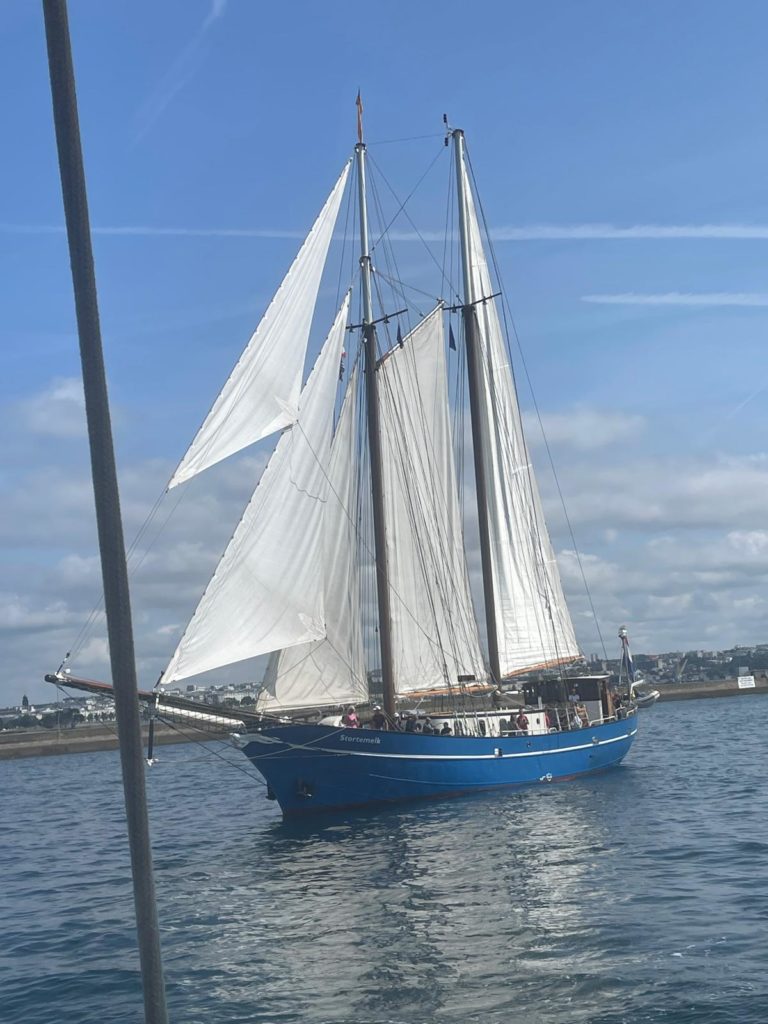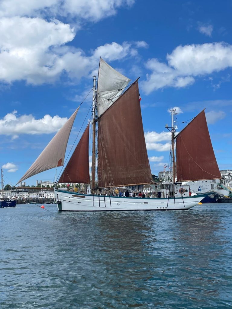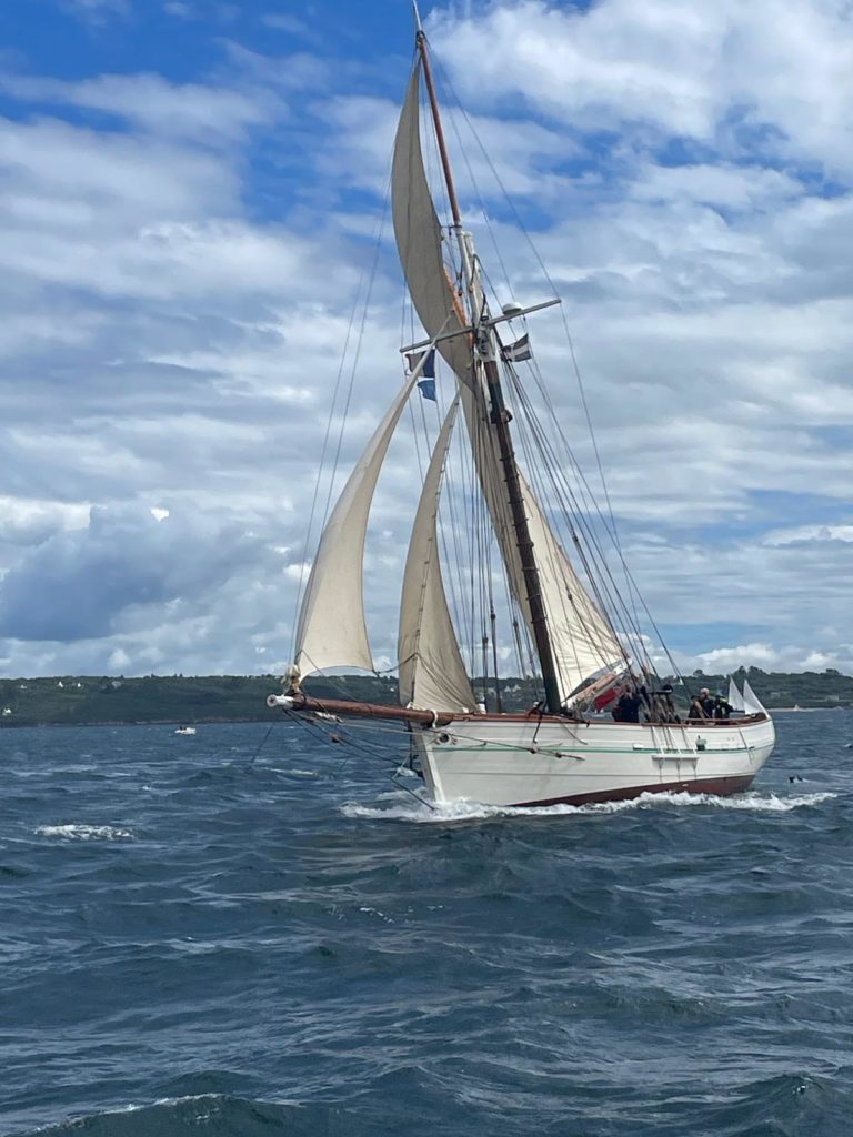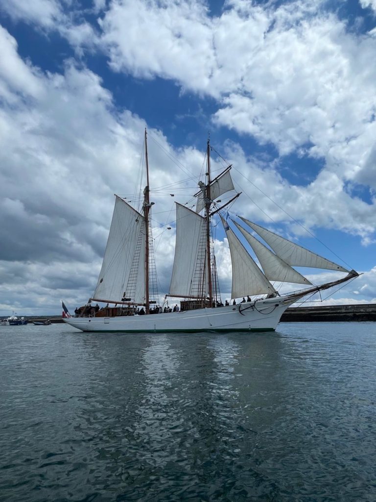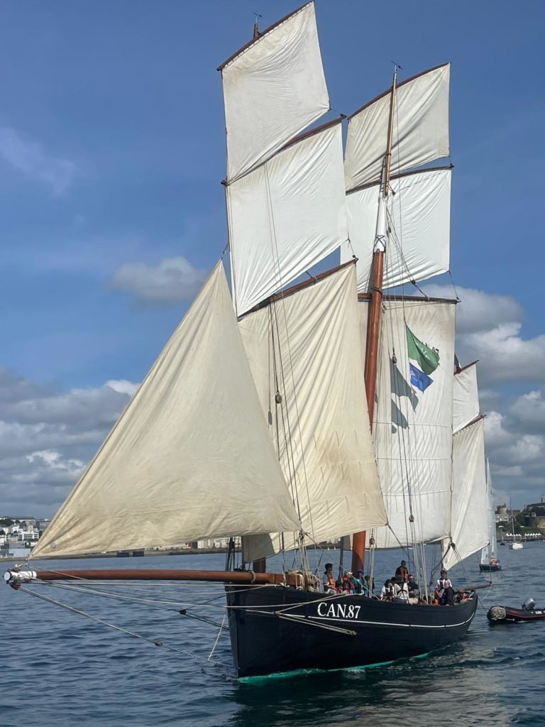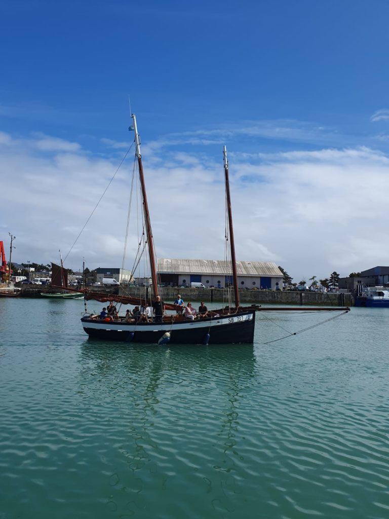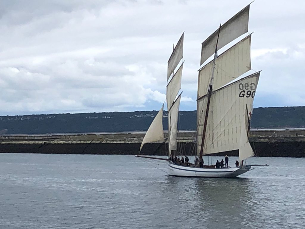 Le 8 juillet, La Granvillaise a quitté le port de Granville vers 10H00 et a fait route vers l’ouest jusqu’à l’Aber Wrac’h mardi 9 juillet en soirée. L’équipage fait route plein ouest sous taille vent, misaine, tape cul, grand foc et huniers.