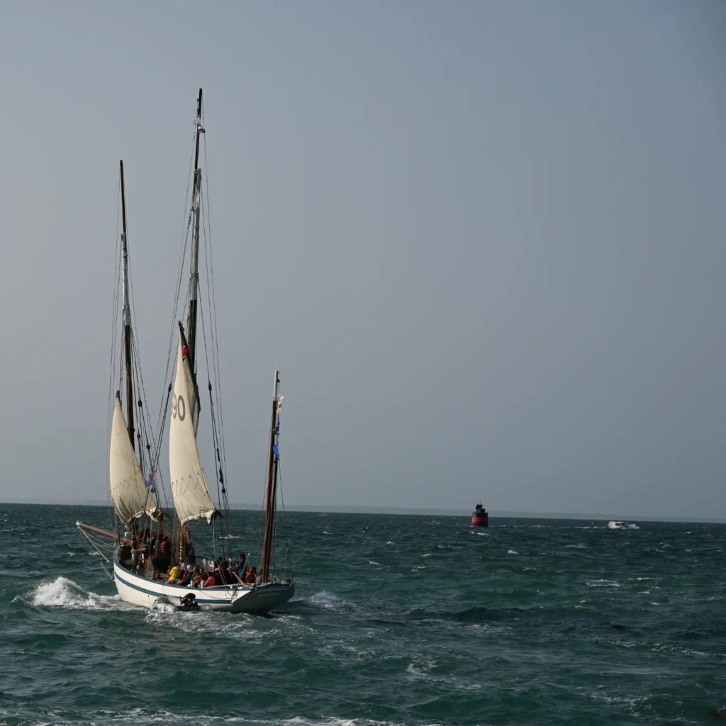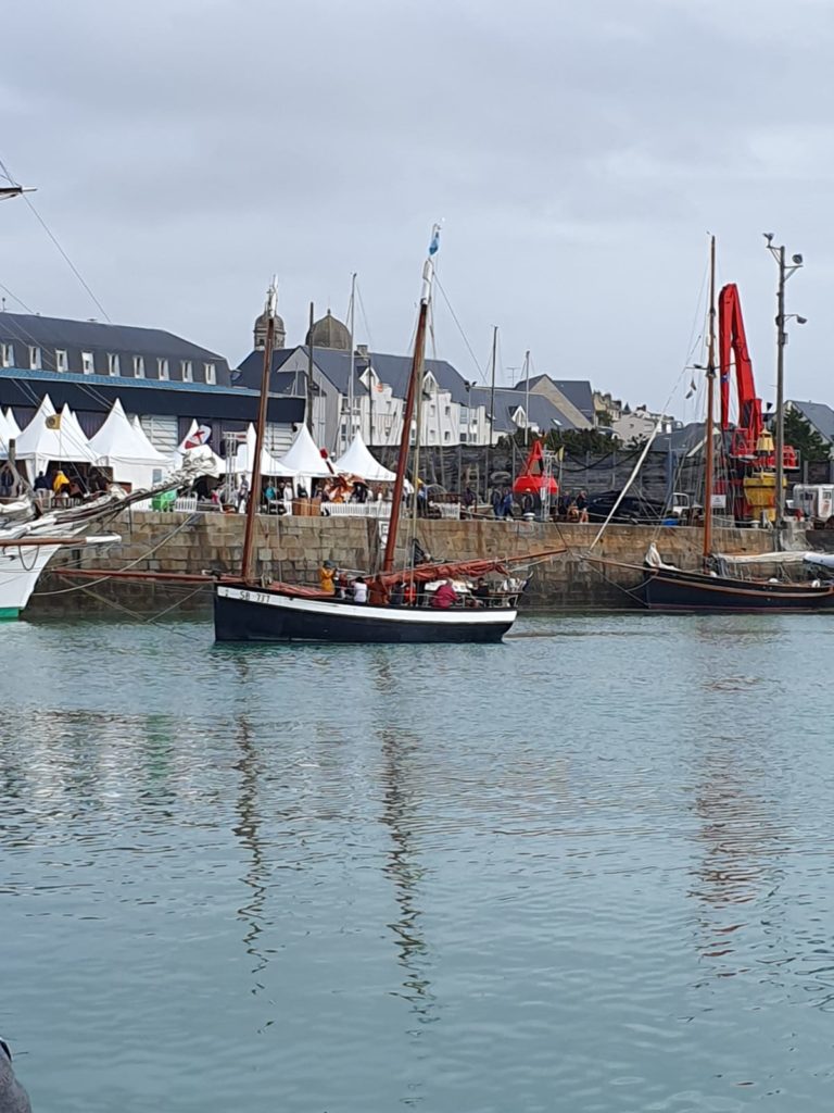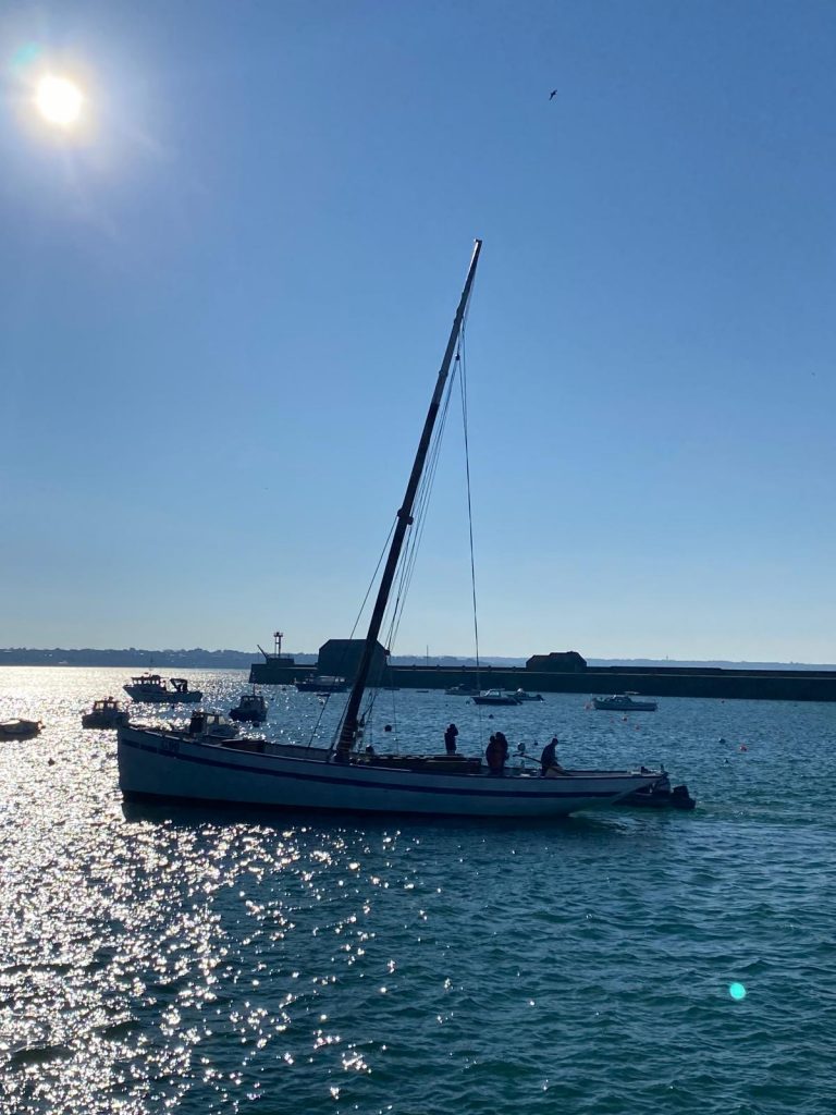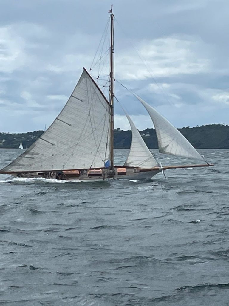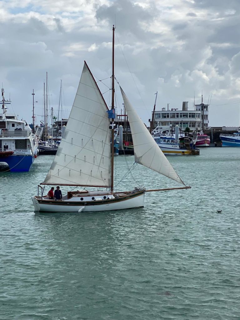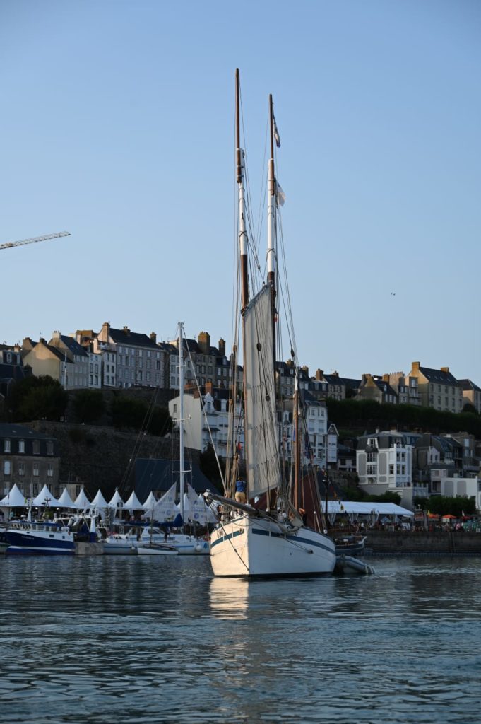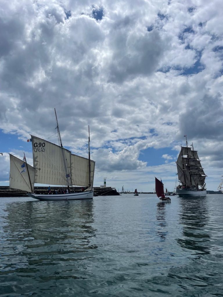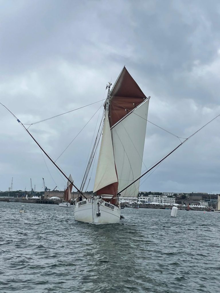 Le 8 juillet, La Granvillaise a quitté le port de Granville vers 10H00 et a fait route vers l’ouest jusqu’à l’Aber Wrac’h mardi 9 juillet en soirée. L’équipage fait route plein ouest sous taille vent, misaine, tape cul, grand foc et huniers.