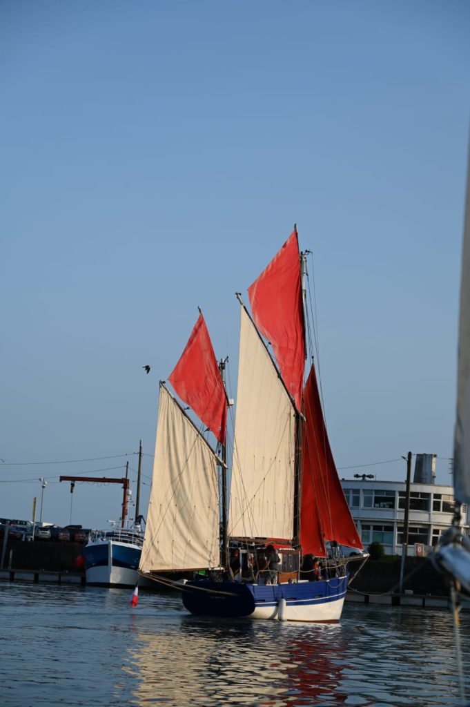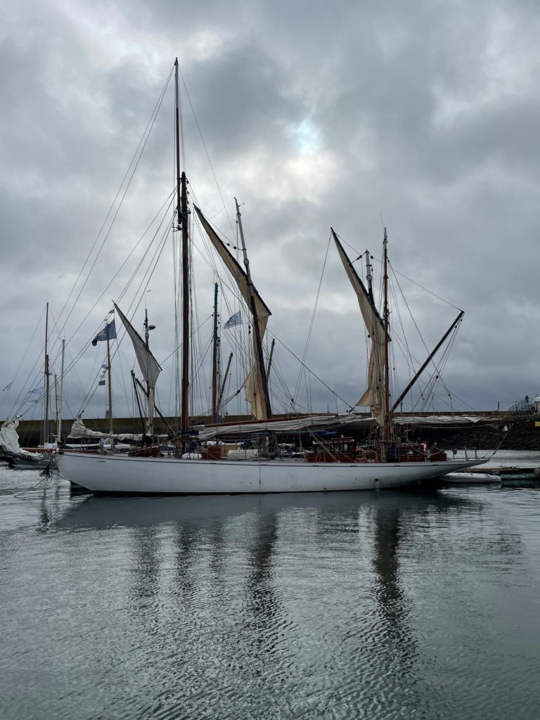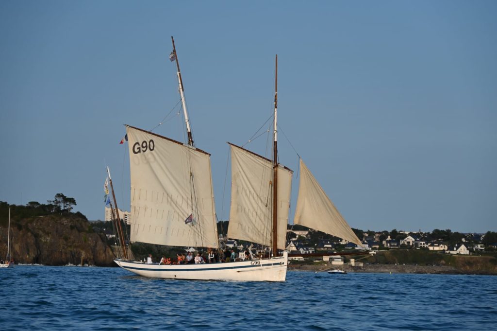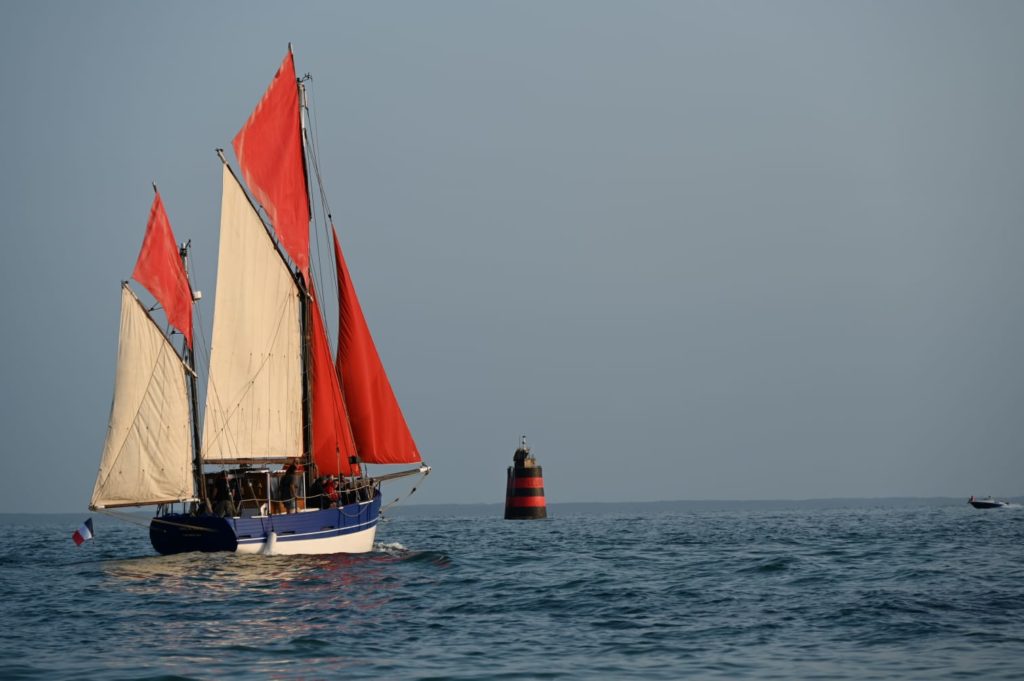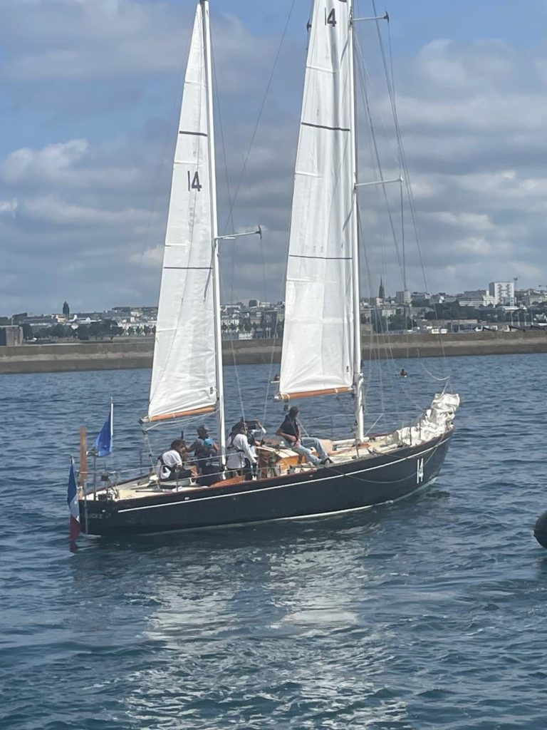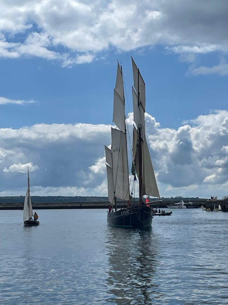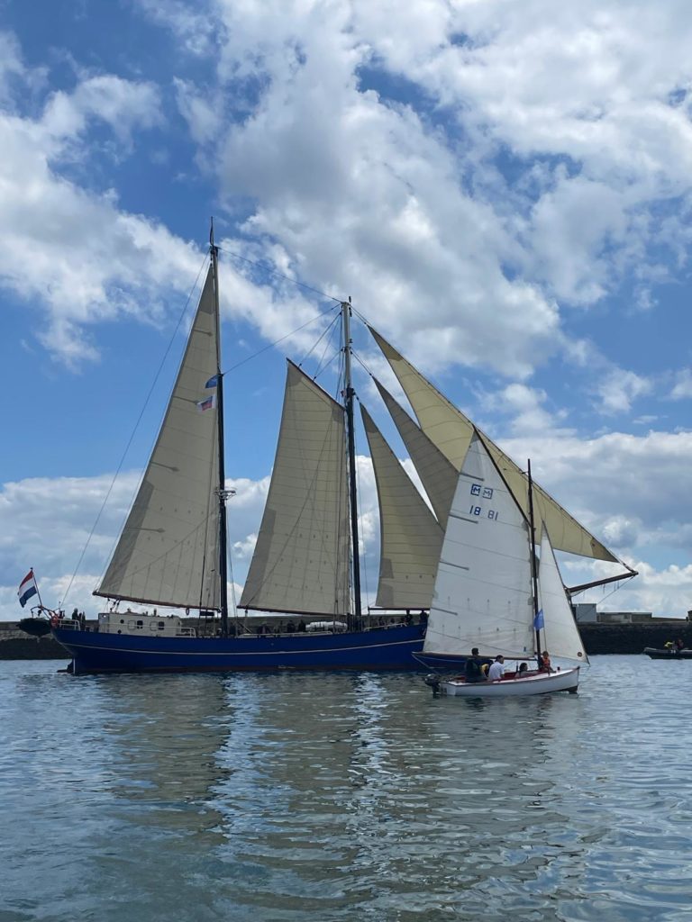 Le 8 juillet, La Granvillaise a quitté le port de Granville vers 10H00 et a fait route vers l’ouest jusqu’à l’Aber Wrac’h mardi 9 juillet en soirée. L’équipage fait route plein ouest sous taille vent, misaine, tape cul, grand foc et huniers.