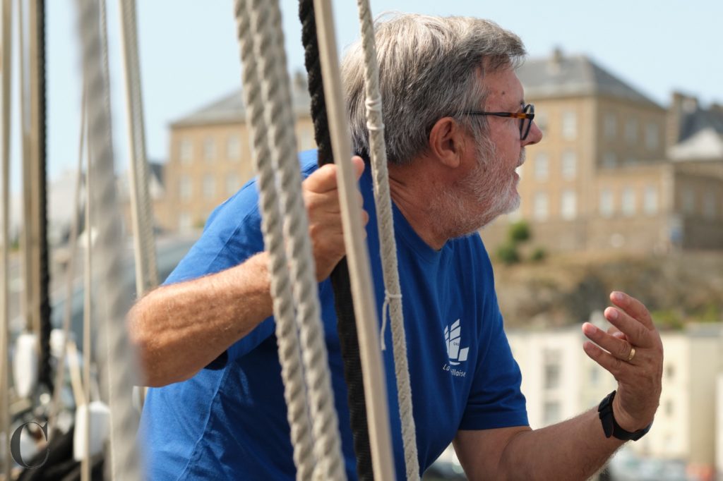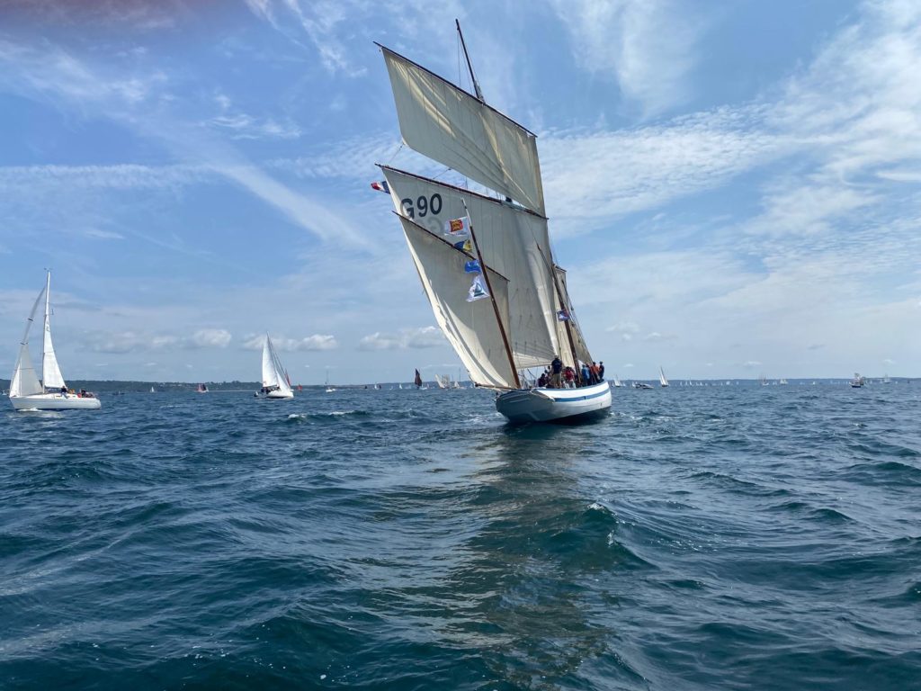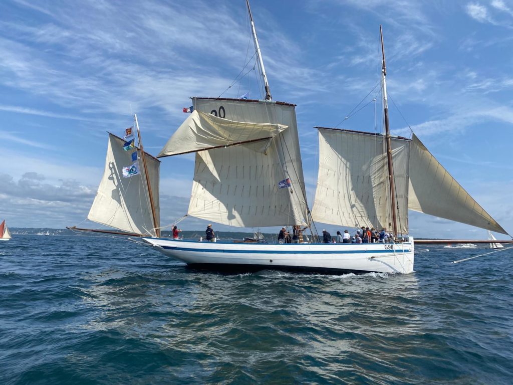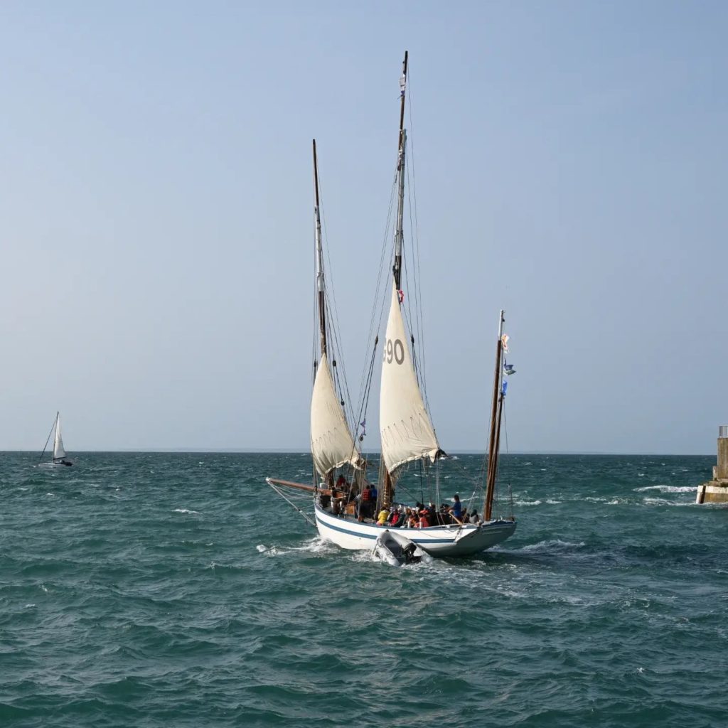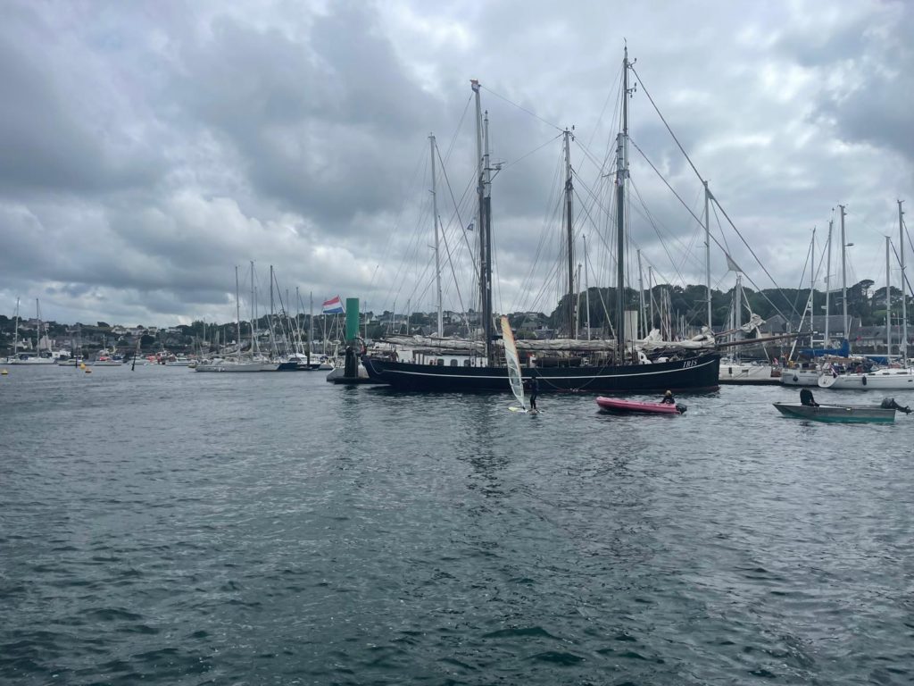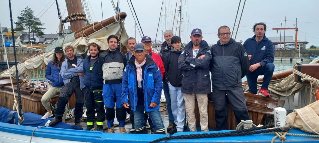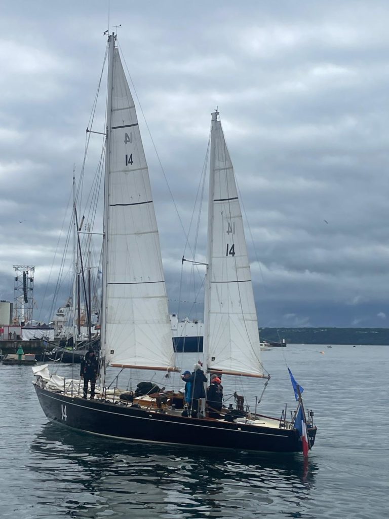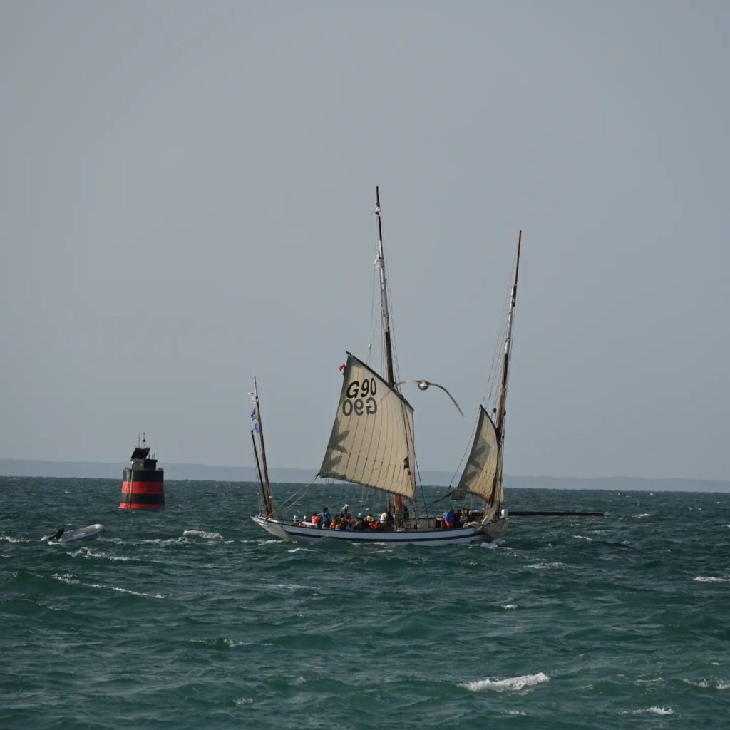 Le 8 juillet, La Granvillaise a quitté le port de Granville vers 10H00 et a fait route vers l’ouest jusqu’à l’Aber Wrac’h mardi 9 juillet en soirée. L’équipage fait route plein ouest sous taille vent, misaine, tape cul, grand foc et huniers.