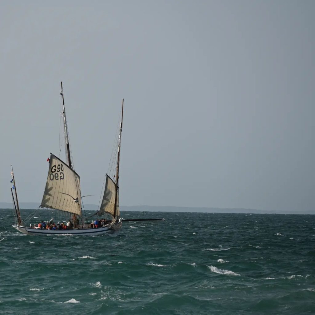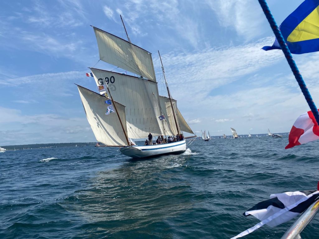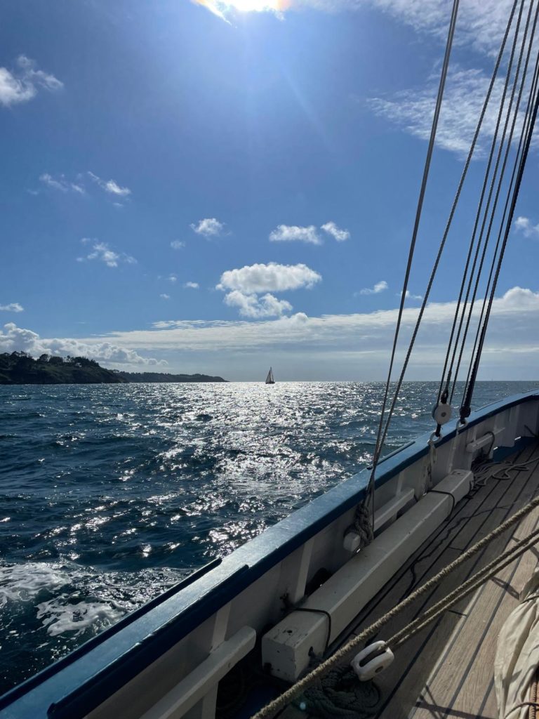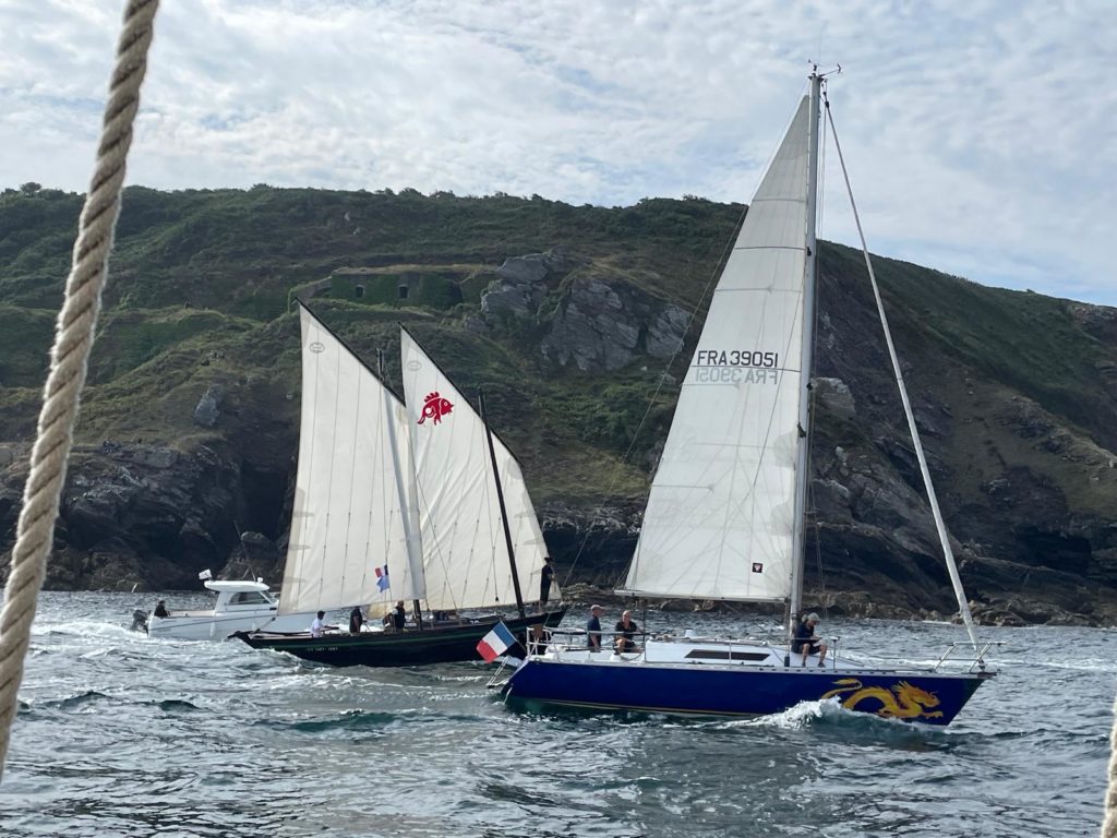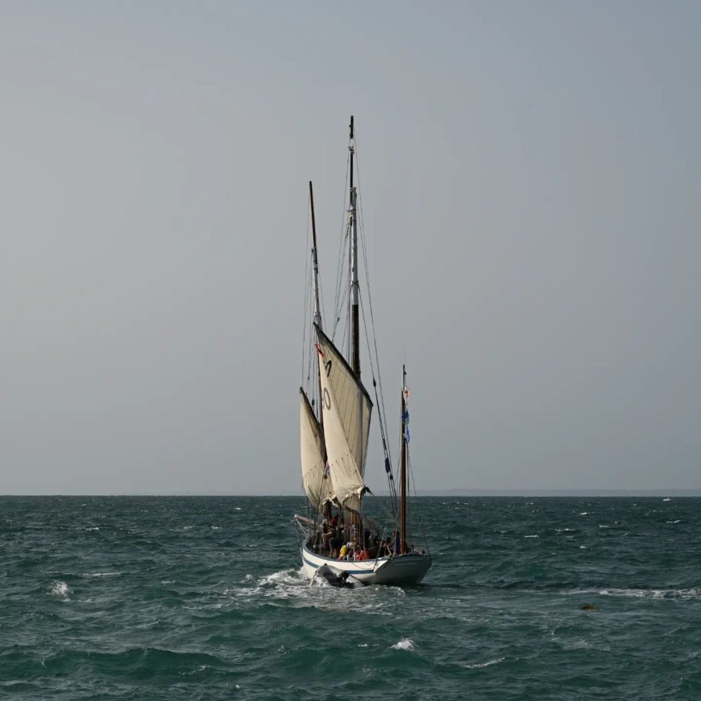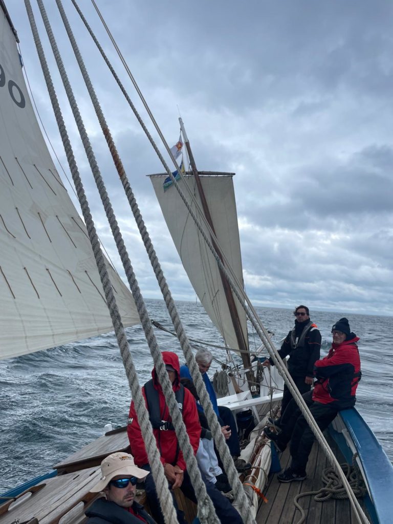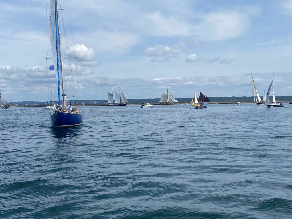 Le 8 juillet, La Granvillaise a quitté le port de Granville vers 10H00 et a fait route vers l’ouest jusqu’à l’Aber Wrac’h mardi 9 juillet en soirée. L’équipage fait route plein ouest sous taille vent, misaine, tape cul, grand foc et huniers.