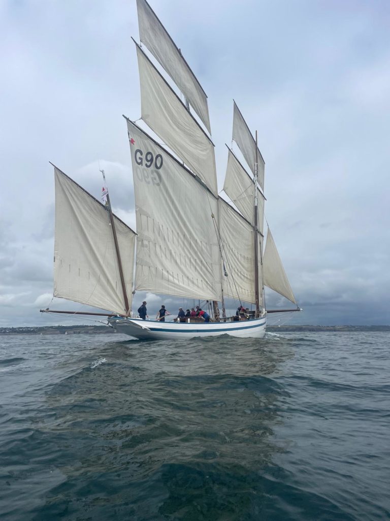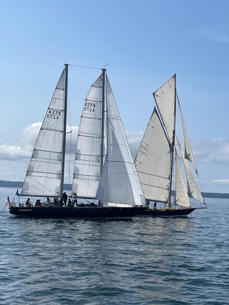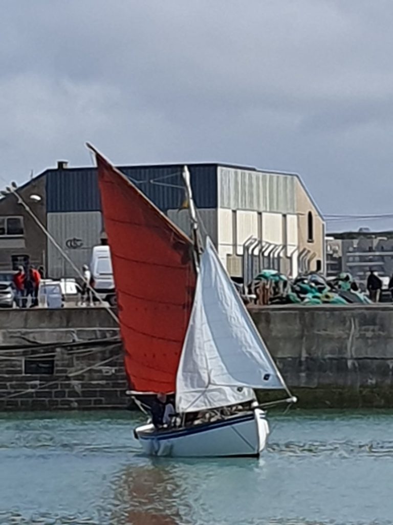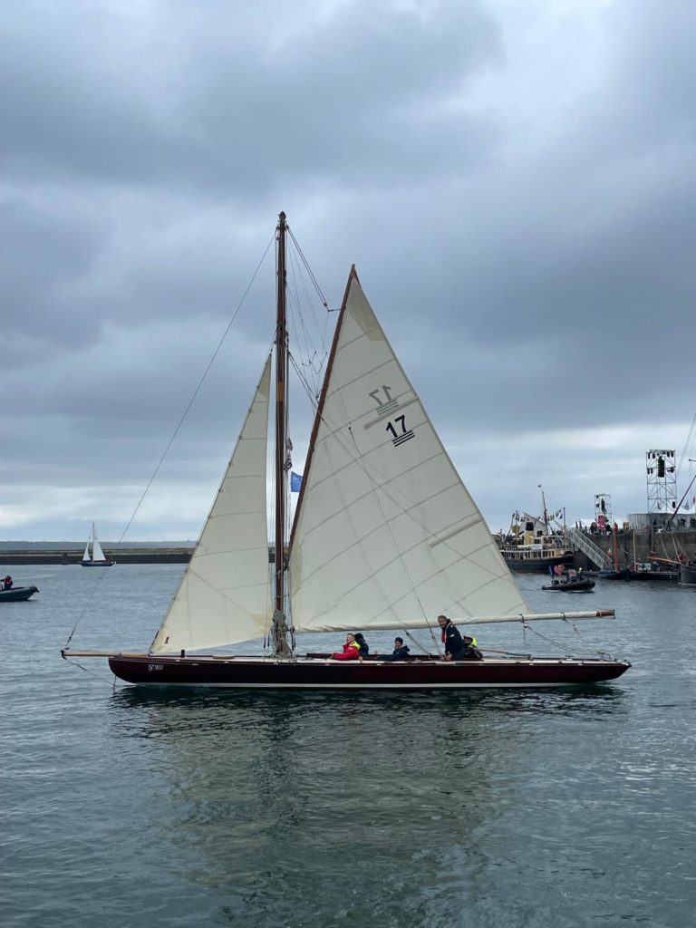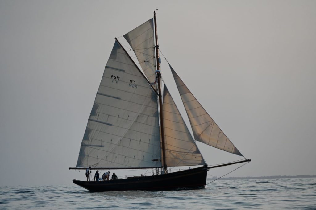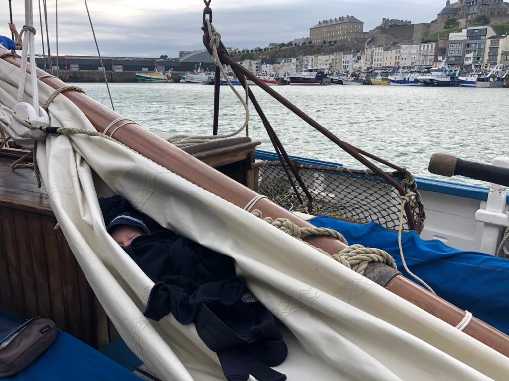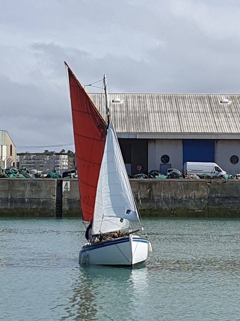 Le 8 juillet, La Granvillaise a quitté le port de Granville vers 10H00 et a fait route vers l’ouest jusqu’à l’Aber Wrac’h mardi 9 juillet en soirée. L’équipage fait route plein ouest sous taille vent, misaine, tape cul, grand foc et huniers.