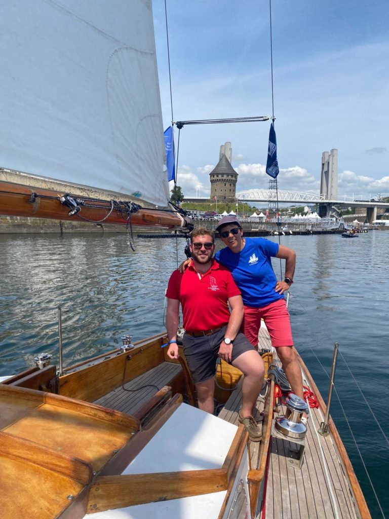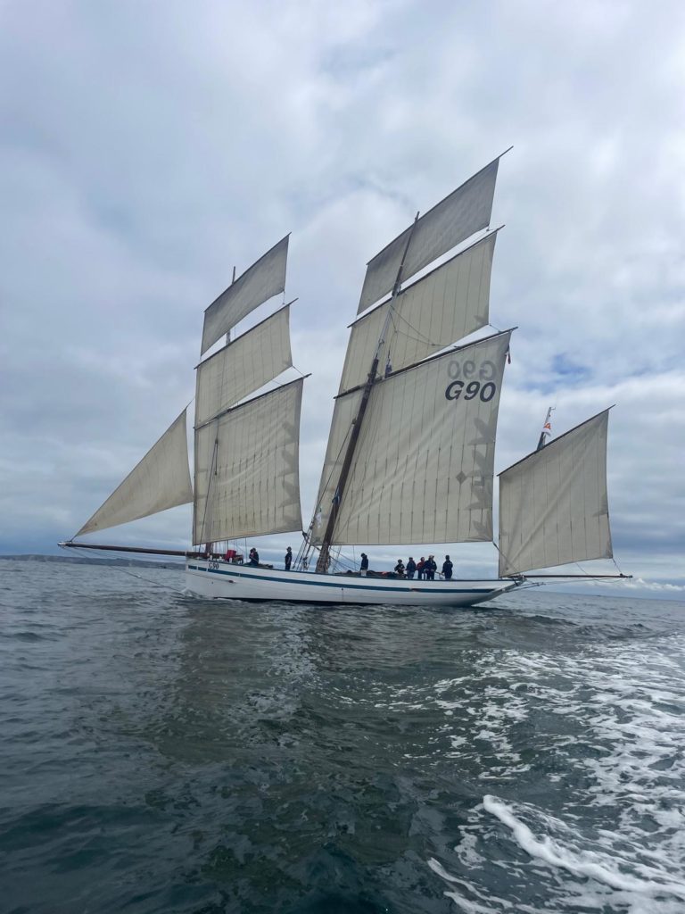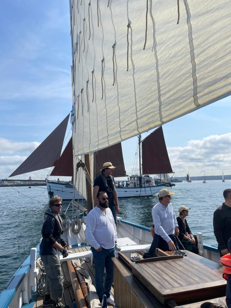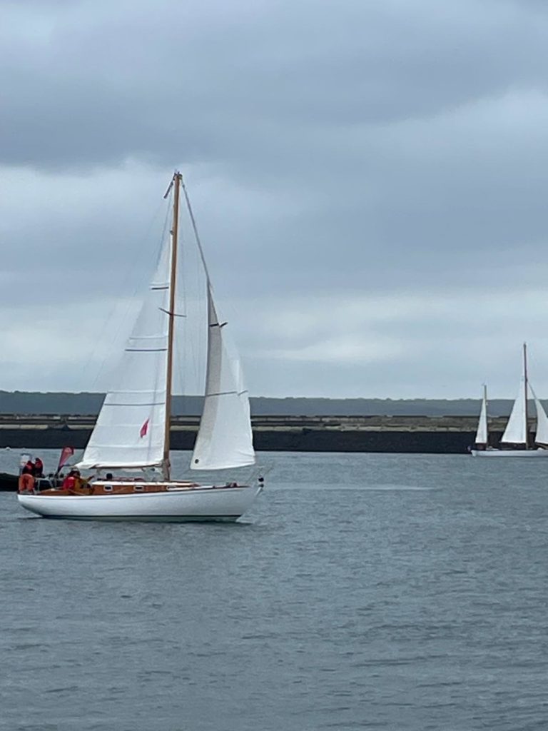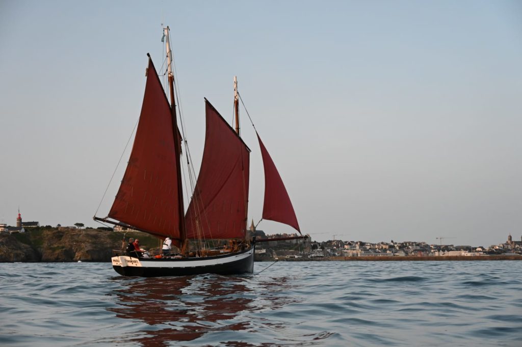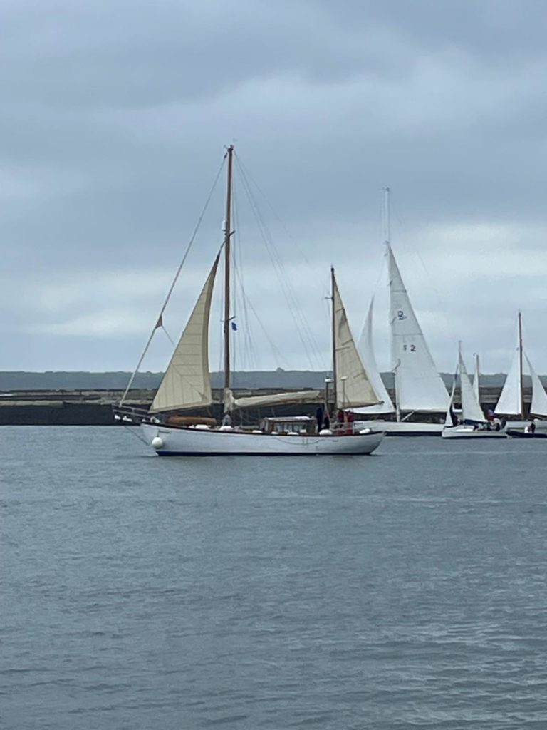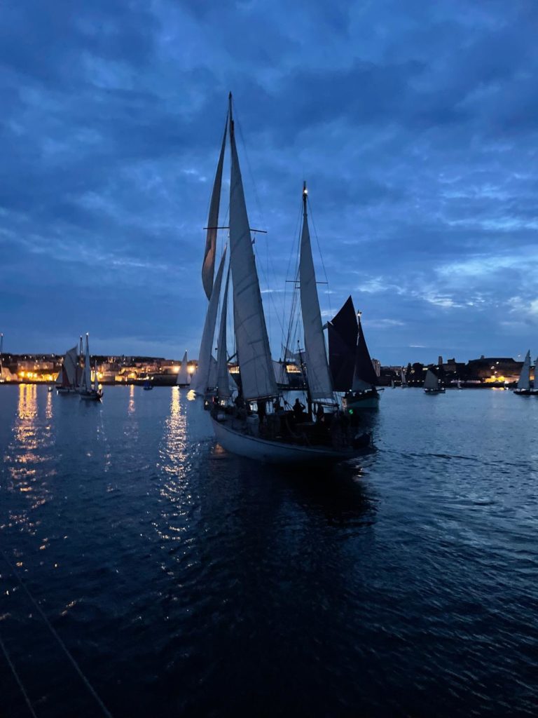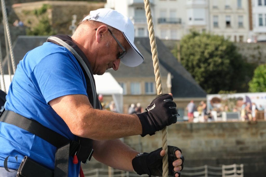 Le 8 juillet, La Granvillaise a quitté le port de Granville vers 10H00 et a fait route vers l’ouest jusqu’à l’Aber Wrac’h mardi 9 juillet en soirée. L’équipage fait route plein ouest sous taille vent, misaine, tape cul, grand foc et huniers.