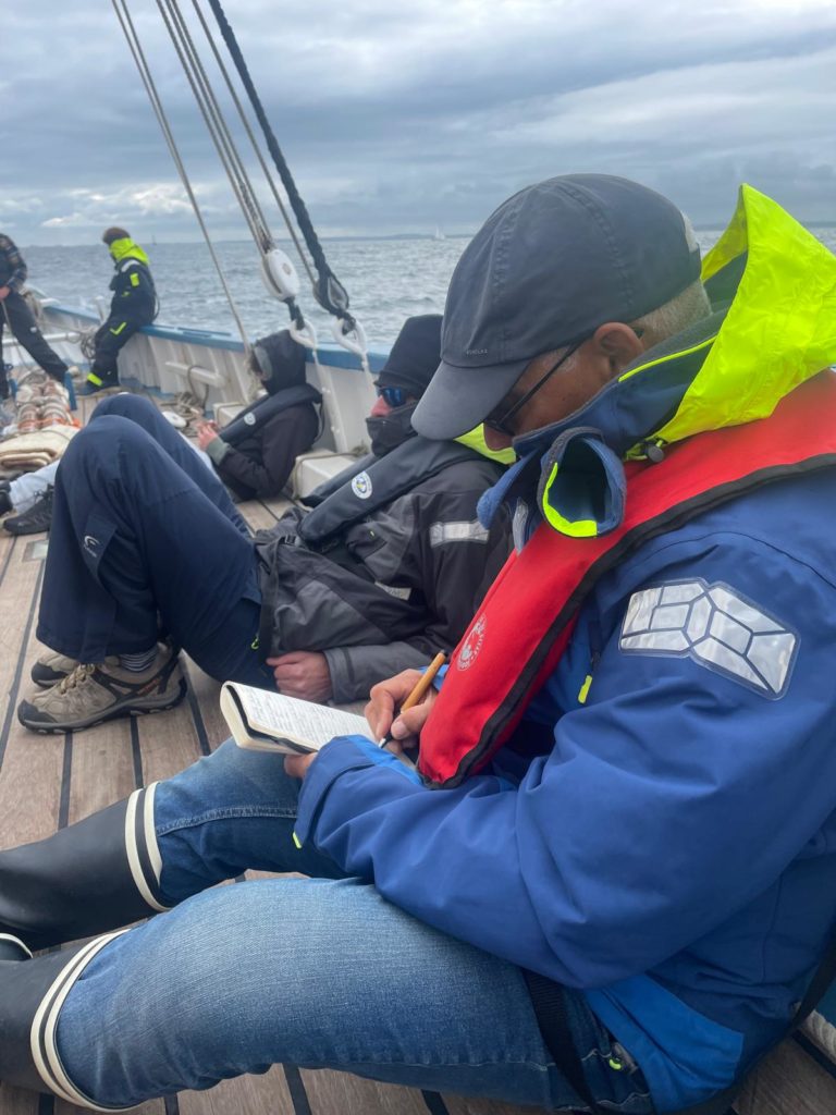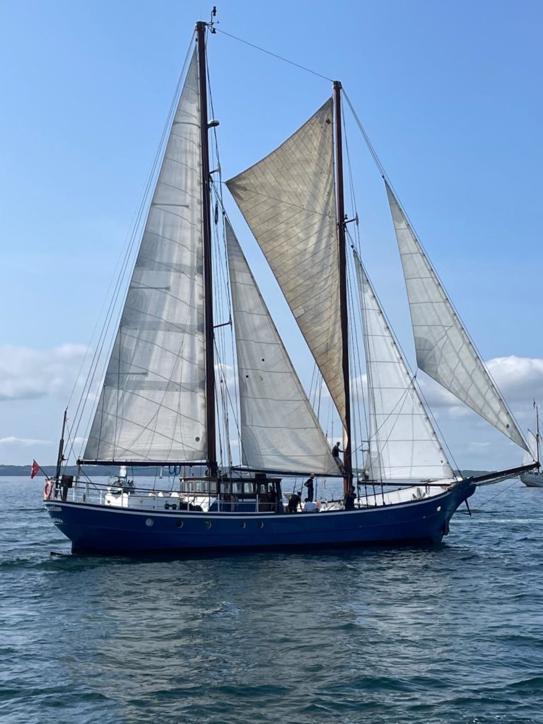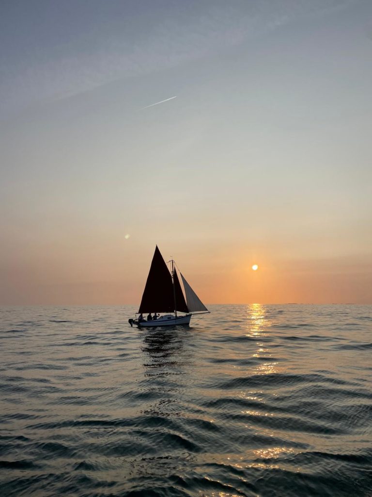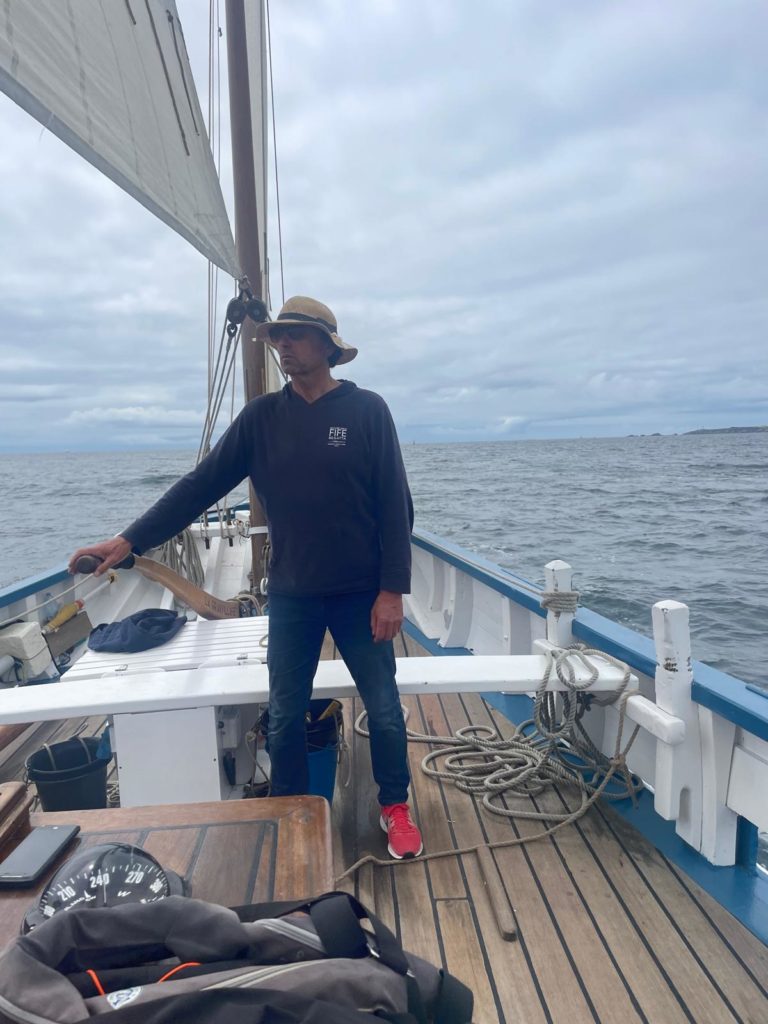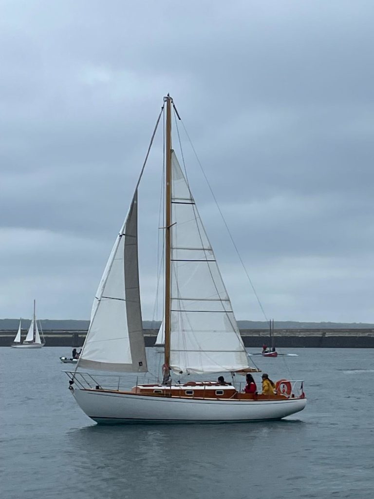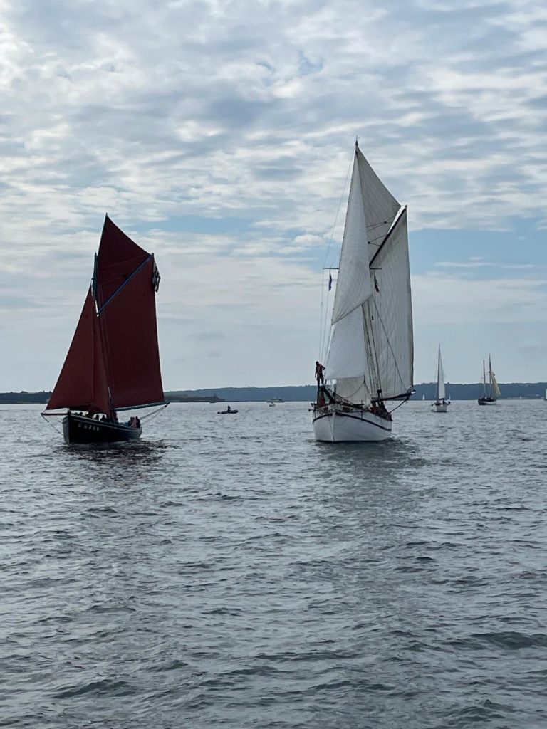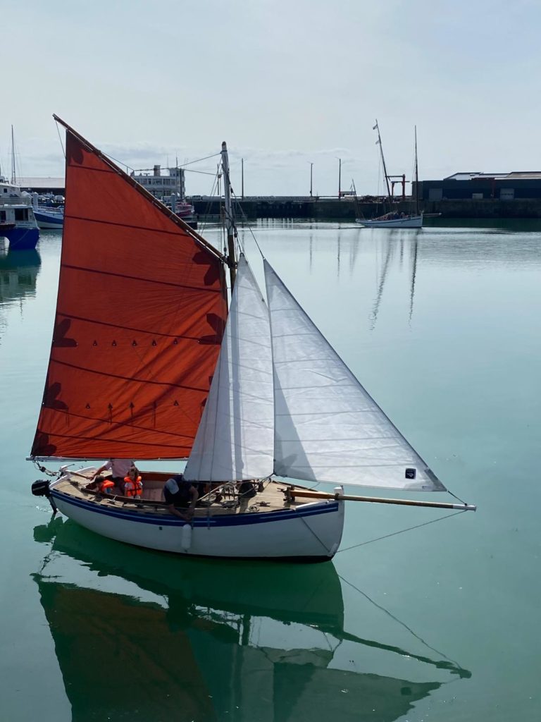 Le 8 juillet, La Granvillaise a quitté le port de Granville vers 10H00 et a fait route vers l’ouest jusqu’à l’Aber Wrac’h mardi 9 juillet en soirée. L’équipage fait route plein ouest sous taille vent, misaine, tape cul, grand foc et huniers.