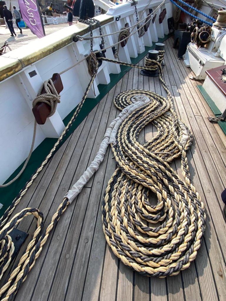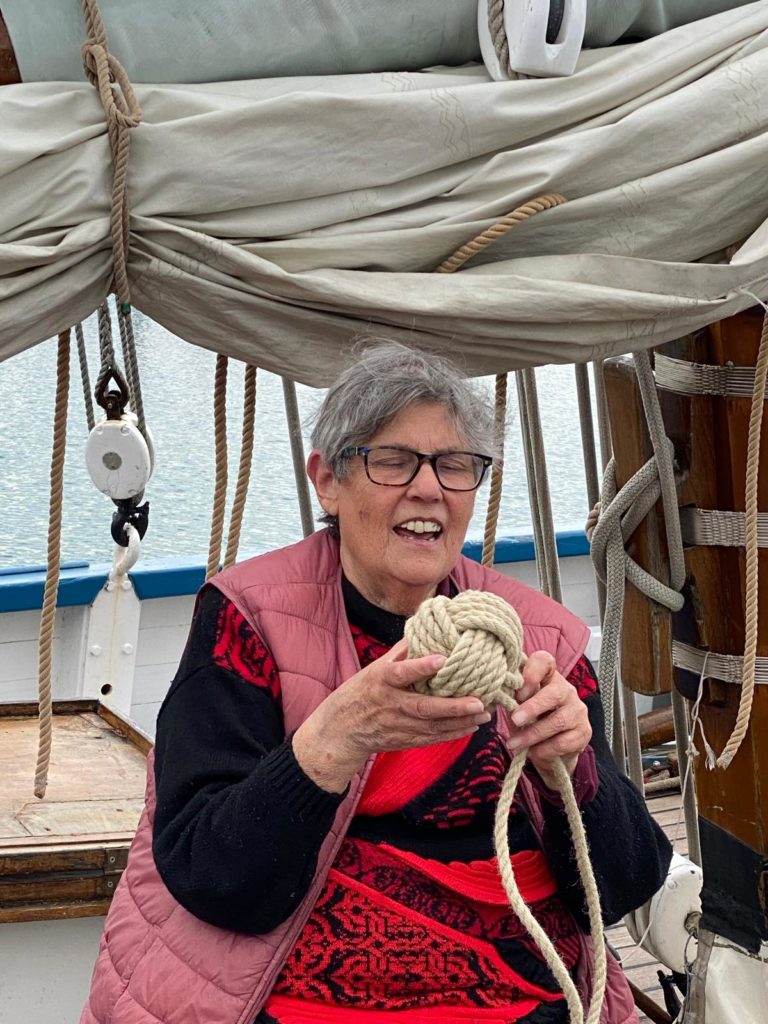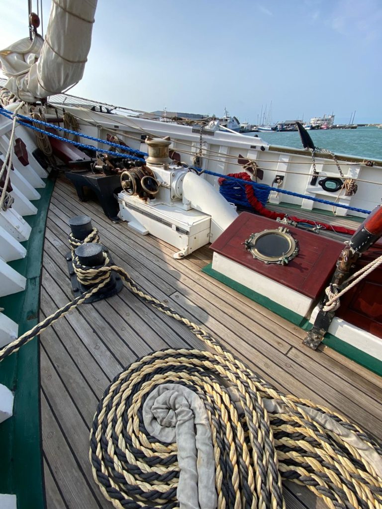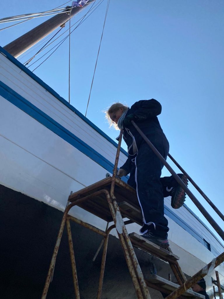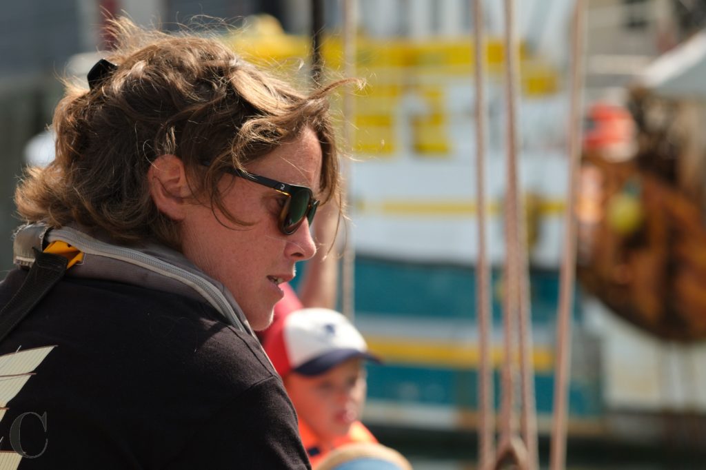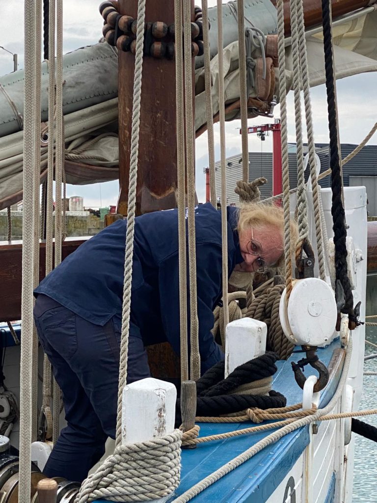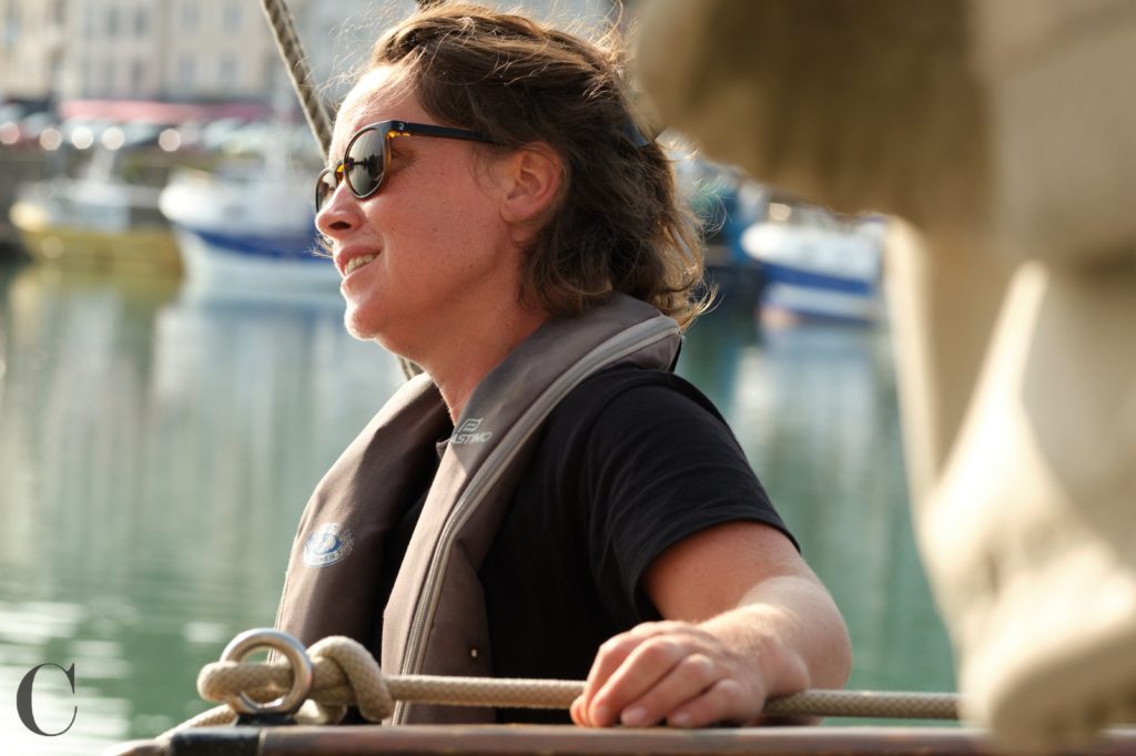 Lucie est matelot de pont de formation et a une belle expérience à bord de vieux gréements et notamment sur l’Hermione sur laquelle elle était gabière.