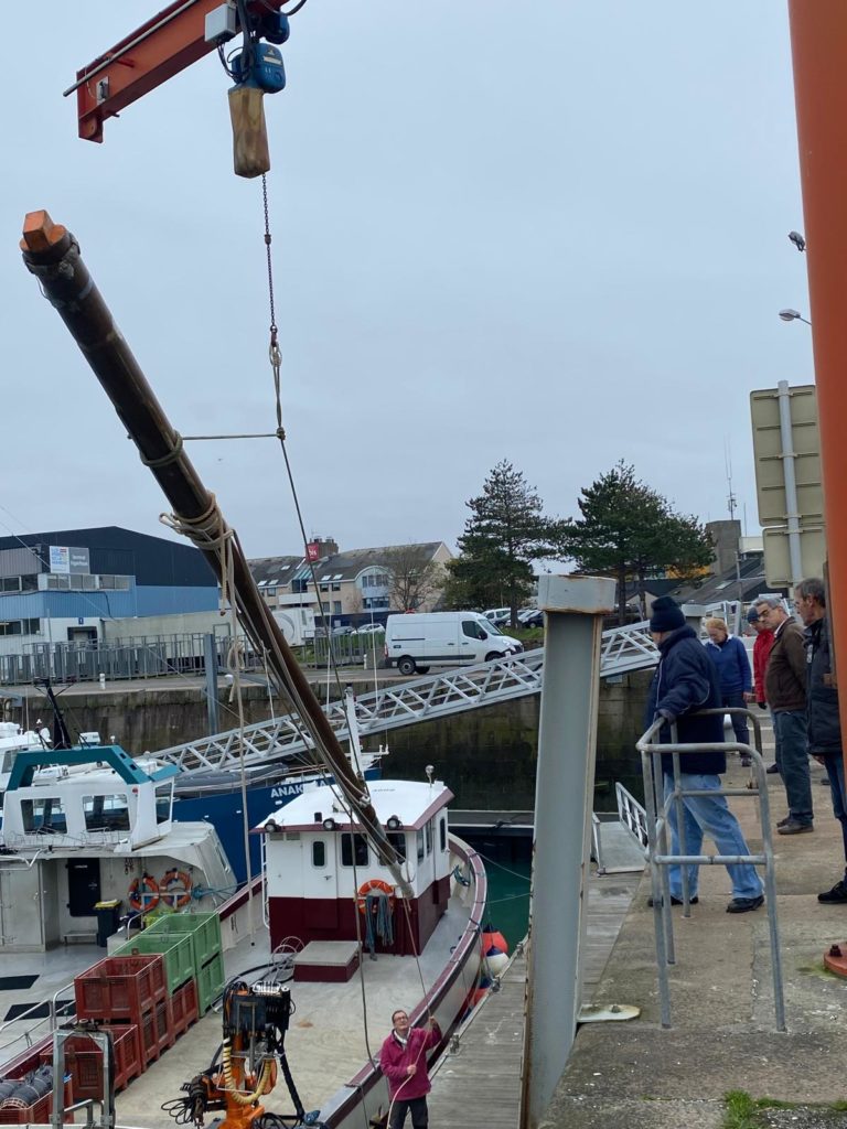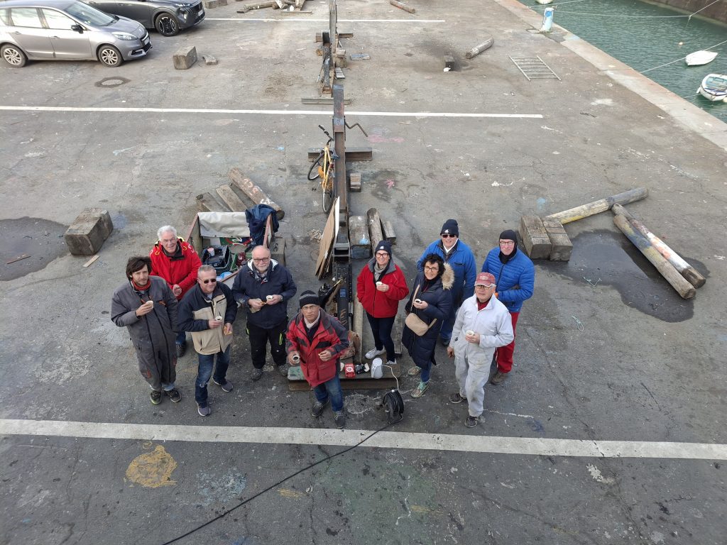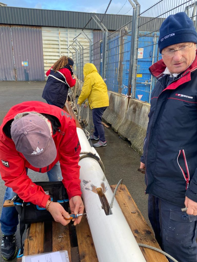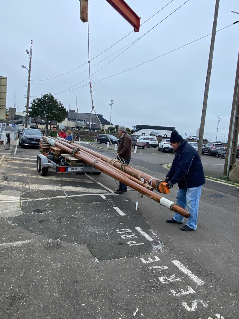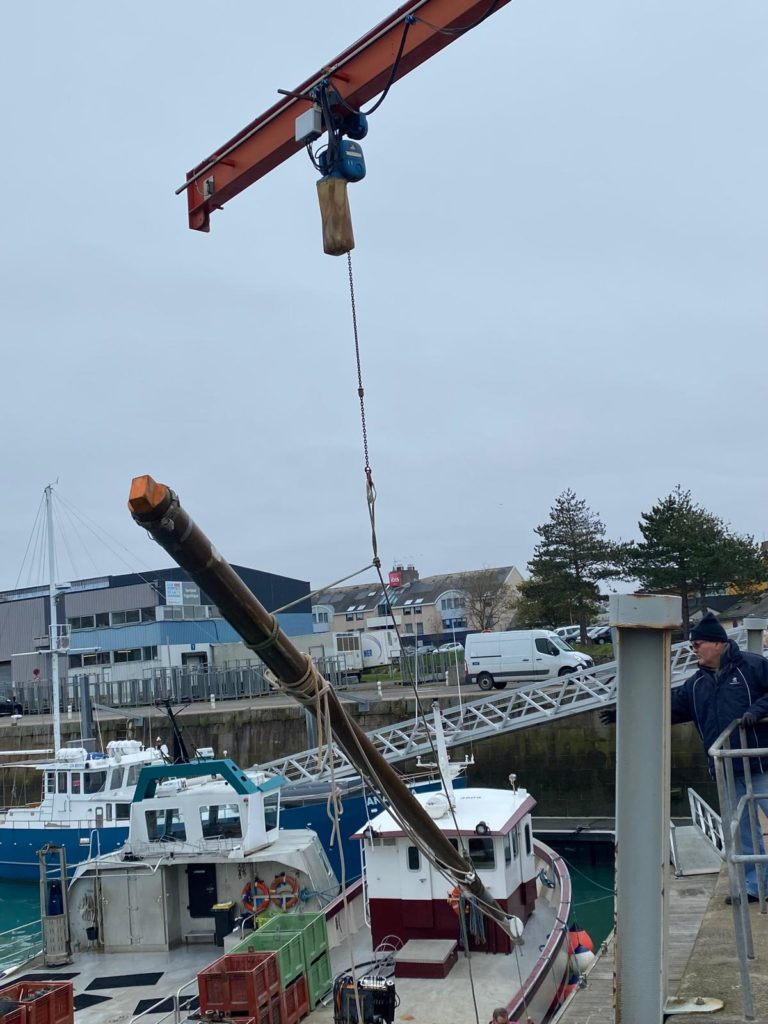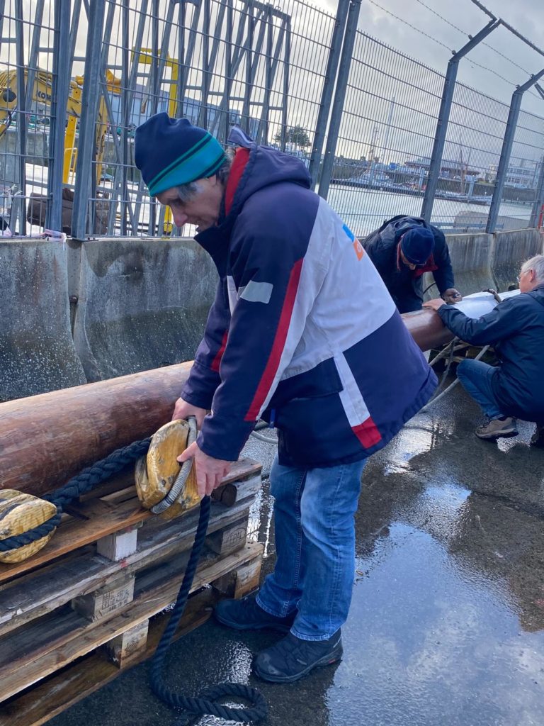 Le démâtage du mât de misaine a été retardé à cause des conditions météorologiques difficiles de la deuxième quinzaine de novembre. Plus de 10 bénévoles de l’association sont venus prêter main forte à l’opération. La grue de Gadel Levage n’a fait qu’une bouchée de cette tâche. Woodspars, le fabricant du nouveau mât va venir prendre les cotes dans la semaine.