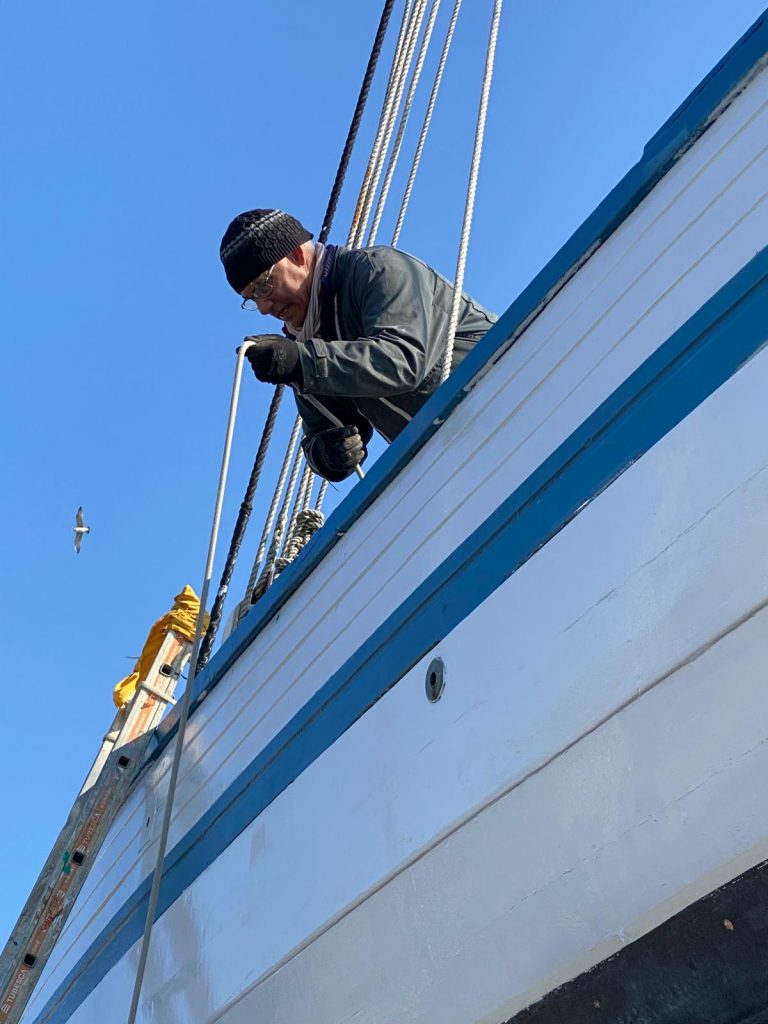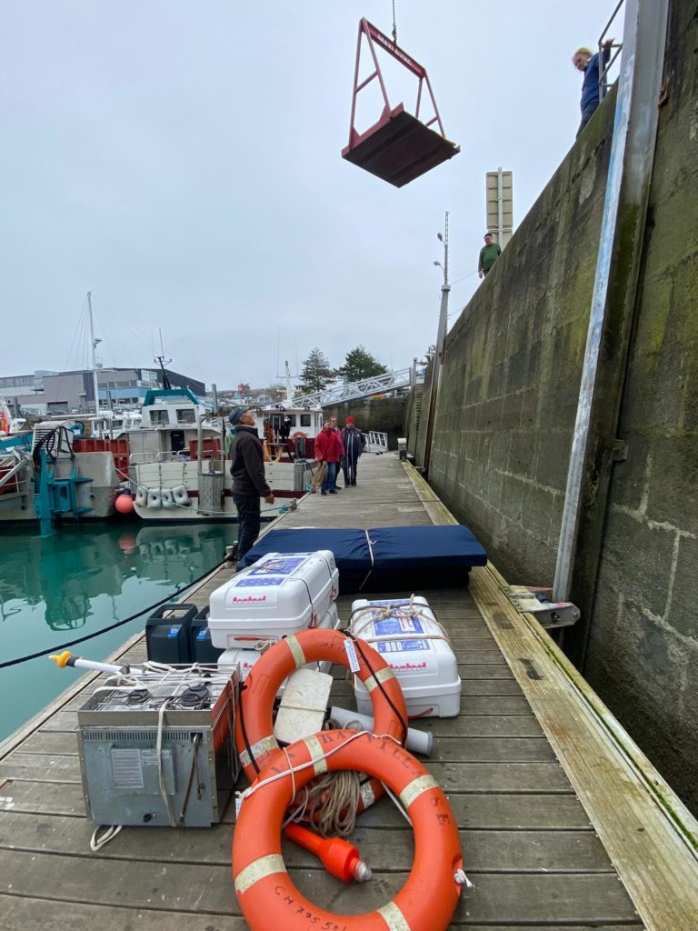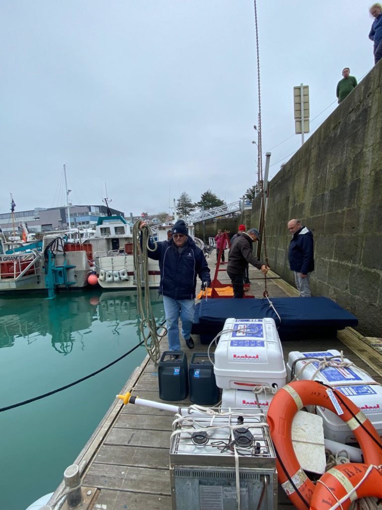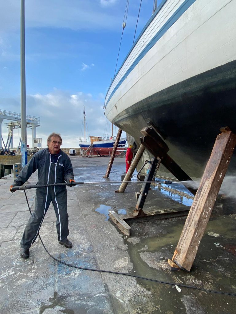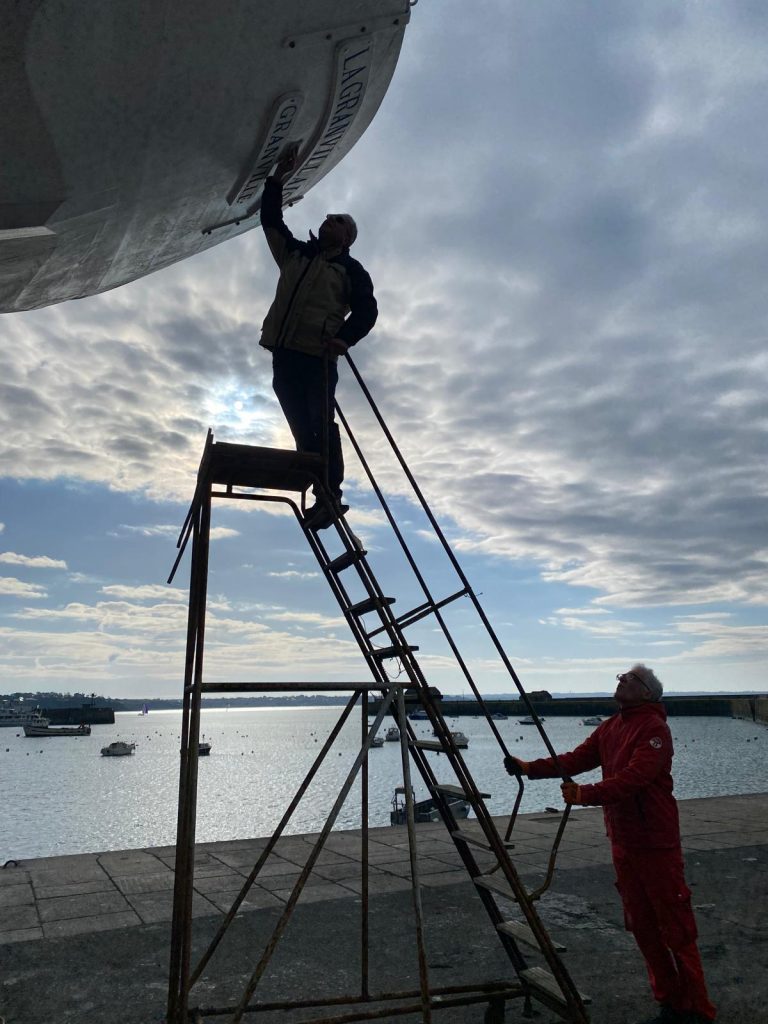 Par un froid de canard, les bénévoles et le nouvel équipage ont sorti la Granvillaise aidés par la nouvelle annexe un 3D Tender de 4.20m flambant neuf. 4 jours pour nettoyer la coque et faire les peintures extérieures.