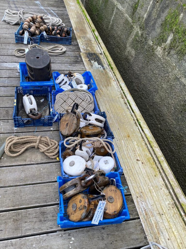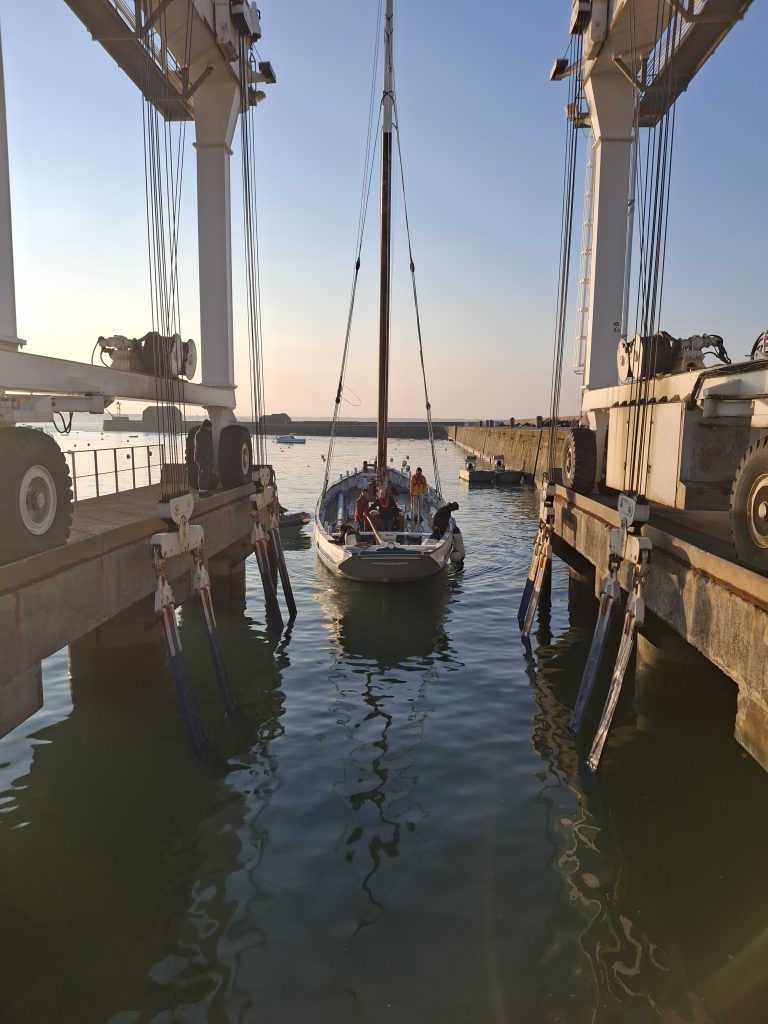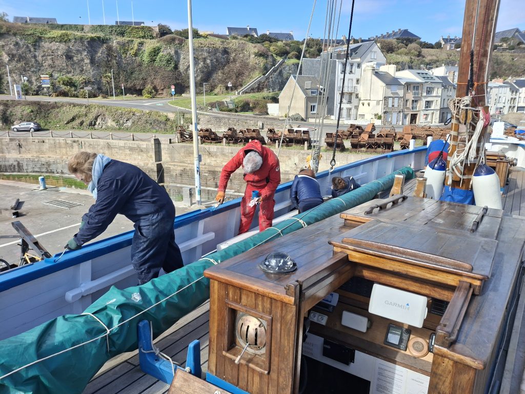 Le désarmement de La Granvillaise s’est déroulée dans de bonnes conditions météorologiques. Une bonne vingtaine de bénévoles ont opéré dans la bonne humeur sous le commandement de Milou. Merci beaucoup ! Apéro et pique-nique sur place. La plus grosse partie des objets et espars sont partis rejoindre l’atelier de Saint Pierre Langers. Les voiles sont stockées au local technique de la ville de Donville.