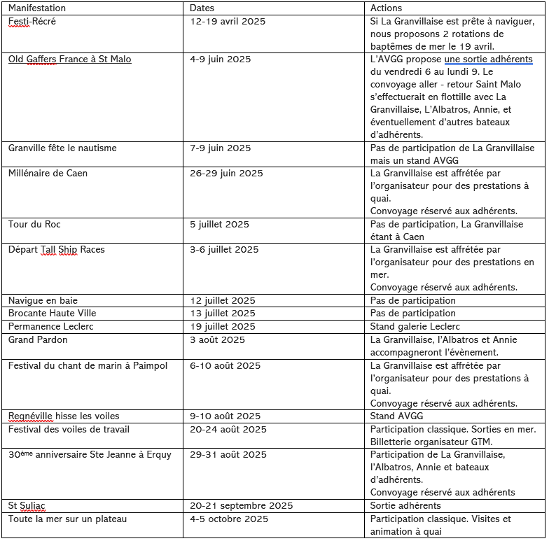 Voici le programme de l’année 2025 avec un accent prononcé pour favoriser les sorties adhérents. Ce programme très complet va nous conduire à St Malo en juin, à Caen, puis au Havre en juillet. Puis ce sera Paimpol et Erquy en août. Et nous terminerons avec un weekend à St Suliac.
