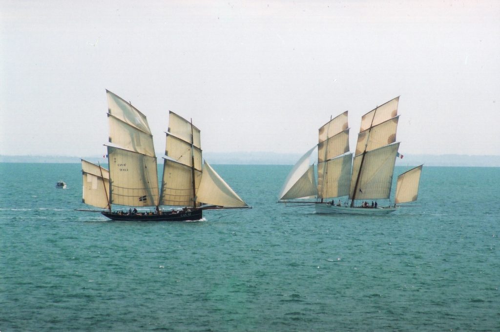 La Cancalaise est venue pour saluer la naissance de sa voisine, heureuse de savoir que les régates de bisquine pourront avoir lieu dès juillet de cette même année. François Bouchard, ancien patron pêcheur de Granville ayant navigué à bord des bisquines, est à la barre de La Granvillaise, trés ému.